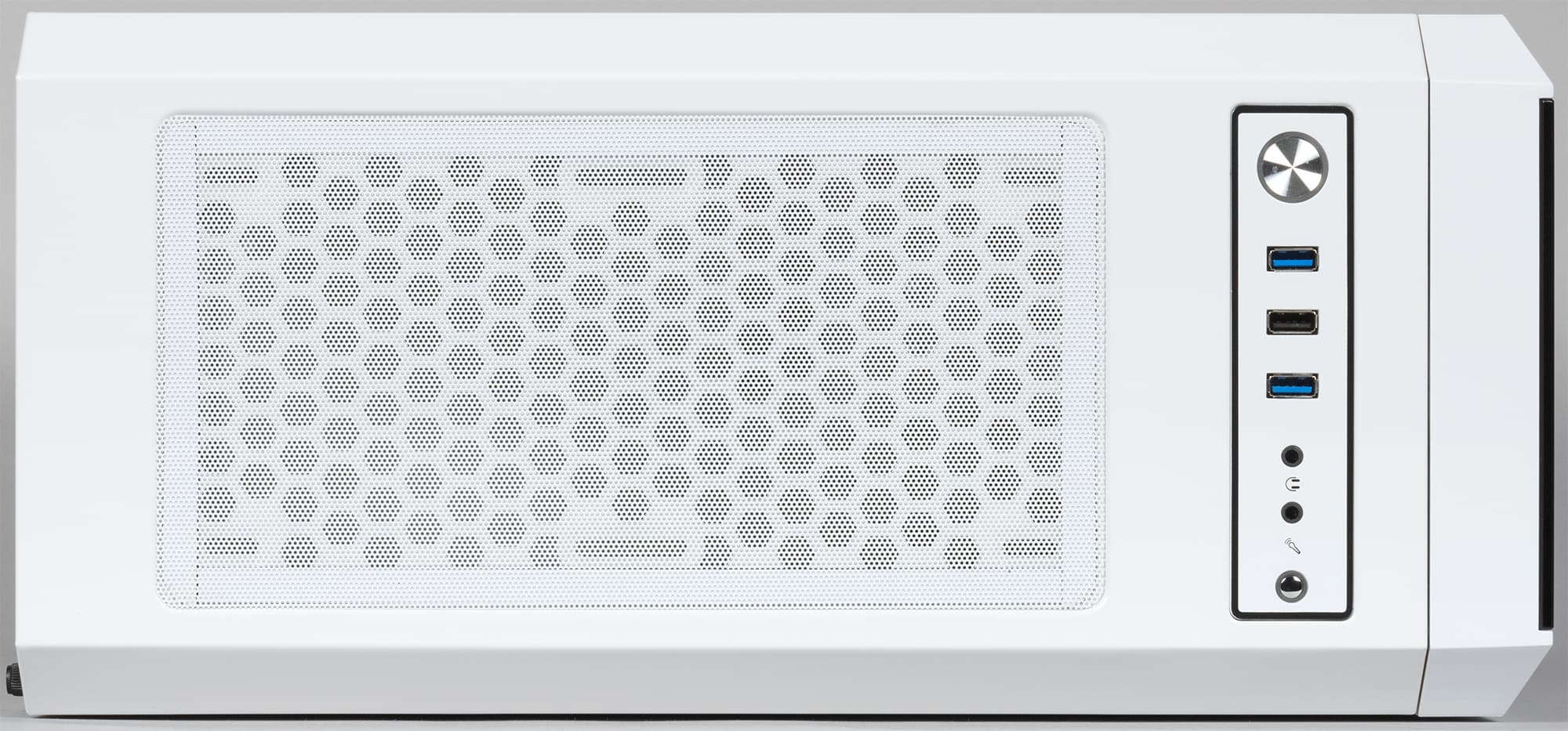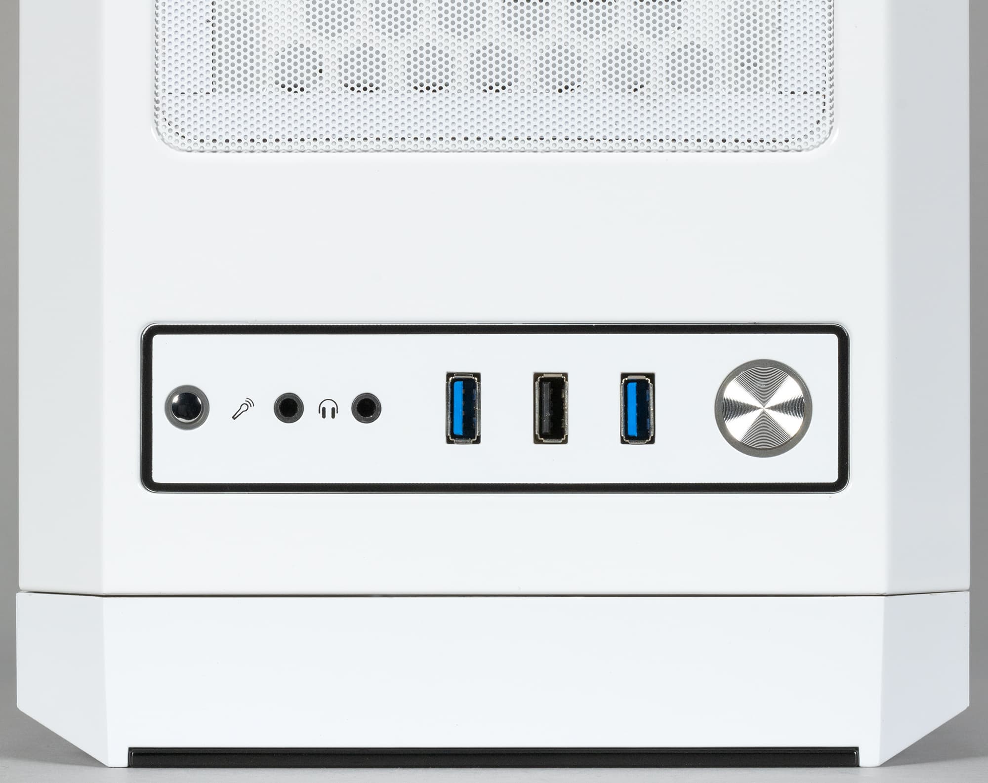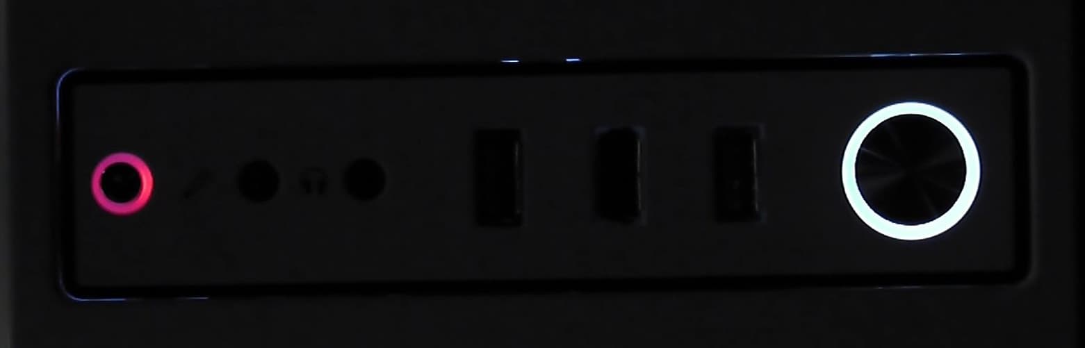 В передней части верхней панели размещены органы управления и коммутации. В их состав входят: три разнесенных друг от друга примерно на 12 мм порта USB (один USB 2.0 и два USB 3.0), стандартные разъемы для подключения микрофона и наушников, большая круглая кнопка включения и кнопка перезагрузки. Кнопки располагаются с разных сторон панели и отличаются размерами.