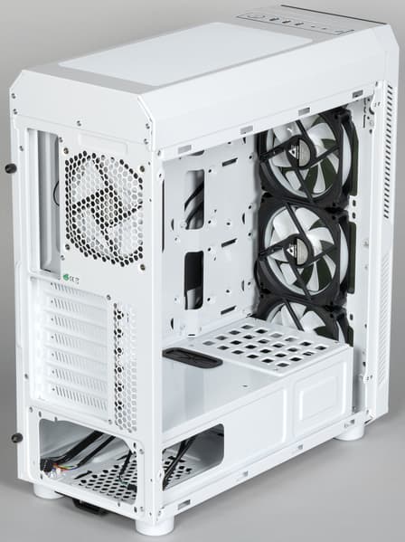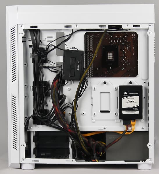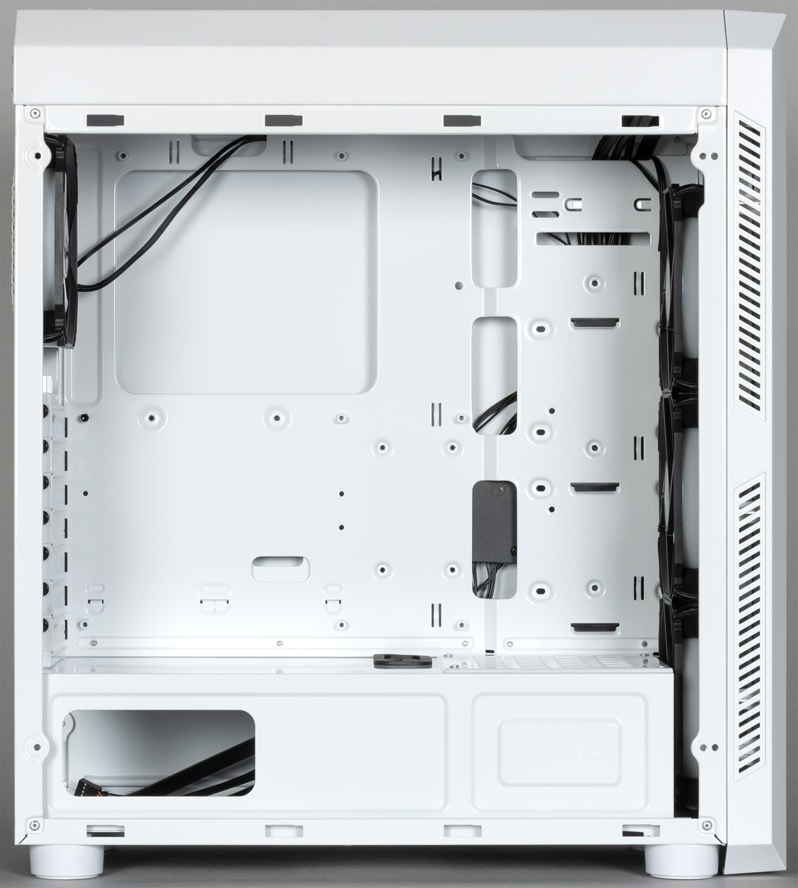 Компоновочные решения данной модели определяются современными тенденциями корпусостроения. В данном случае разработчики отказались от отсека для устройств формата 5,25″, а привычный отсек для устройств 3,5″ расположен около передней стенки шасси, но присутствует он в усеченном виде — всего на два диска. Снять этот отсек нельзя. Посадочные места для накопителей с внешним доступом в корпусе полностью отсутствуют.