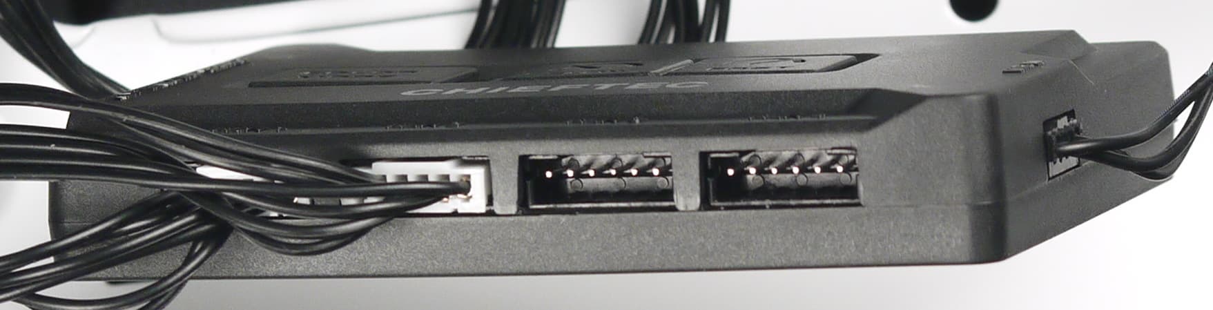Всего к контроллеру можно подключить шесть таких вентиляторов, также есть два стандартных трехконтактных разъема для подключения устройств ARGB с питанием от 5 B. А вот стандартных разъемов для вентиляторов на контроллере нет, что не очень удобно.