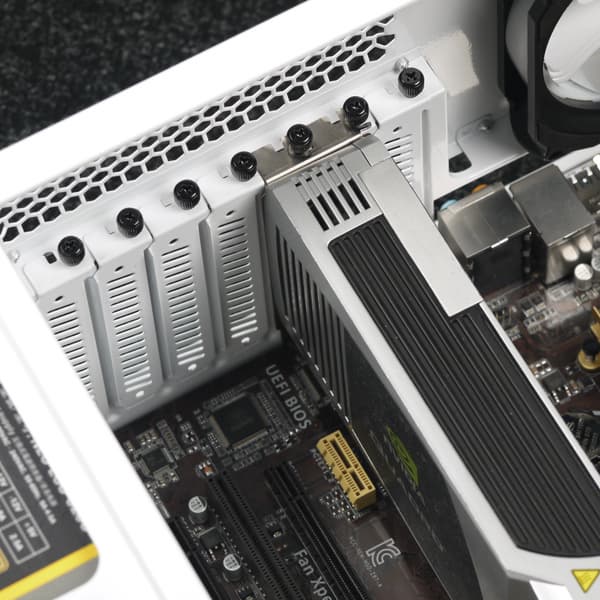 Далее можно установить требуемые платы расширения, например видеокарту, которая, по заявлению производителя, может достигать в длину 349 мм. Расстояние между задней панелью ввода-вывода и передней стенкой шасси у этого корпуса составляет около 380 мм, с учетом установленных спереди и сзади вентиляторов остается около 355 мм, поэтому 349 мм — это вполне реалистичное значение. Хотя с точки зрения удобства манипуляций лучше ограничиться видеокартой длиной 280 мм.