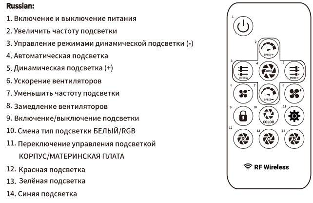 Режимы работы переключаются при помощи двух кнопок ПДУ с изображением вентилятора: правая увеличивает скорость вращения, левая — уменьшает. Никаких других способов управления скоростью вращения вентиляторов не предусмотрено, что может оказаться очень неудобным в случае потери или поломки пульта.