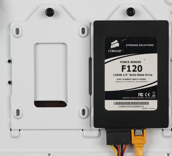 Еще одно посадочное место для накопителя формата 2,5 дюйма расположено около вышеописанных контейнеров на основании для системной платы. Фиксация накопителя осуществляется при помощи винтов, которые нужно вкрутить в накопитель со стороны дна сквозь основание для системной платы (с лицевой стороны), но сюда диск можно установить только до начала монтажа системной платы.