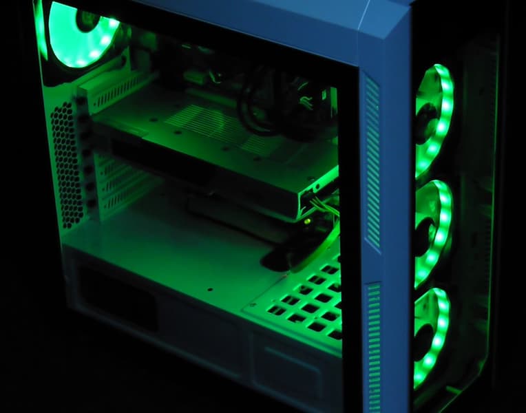 В корпусе можно установить до трех радиаторов: спереди и сверху — до 240 мм, сзади — 120 мм. Но СВО придется подключать к материнской плате и управлять через ее фирменные утилиты.