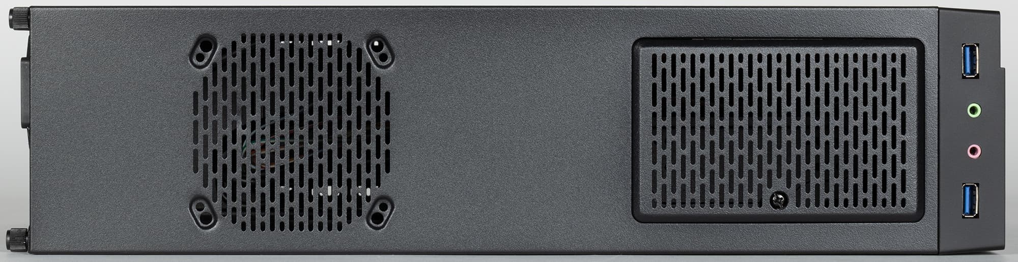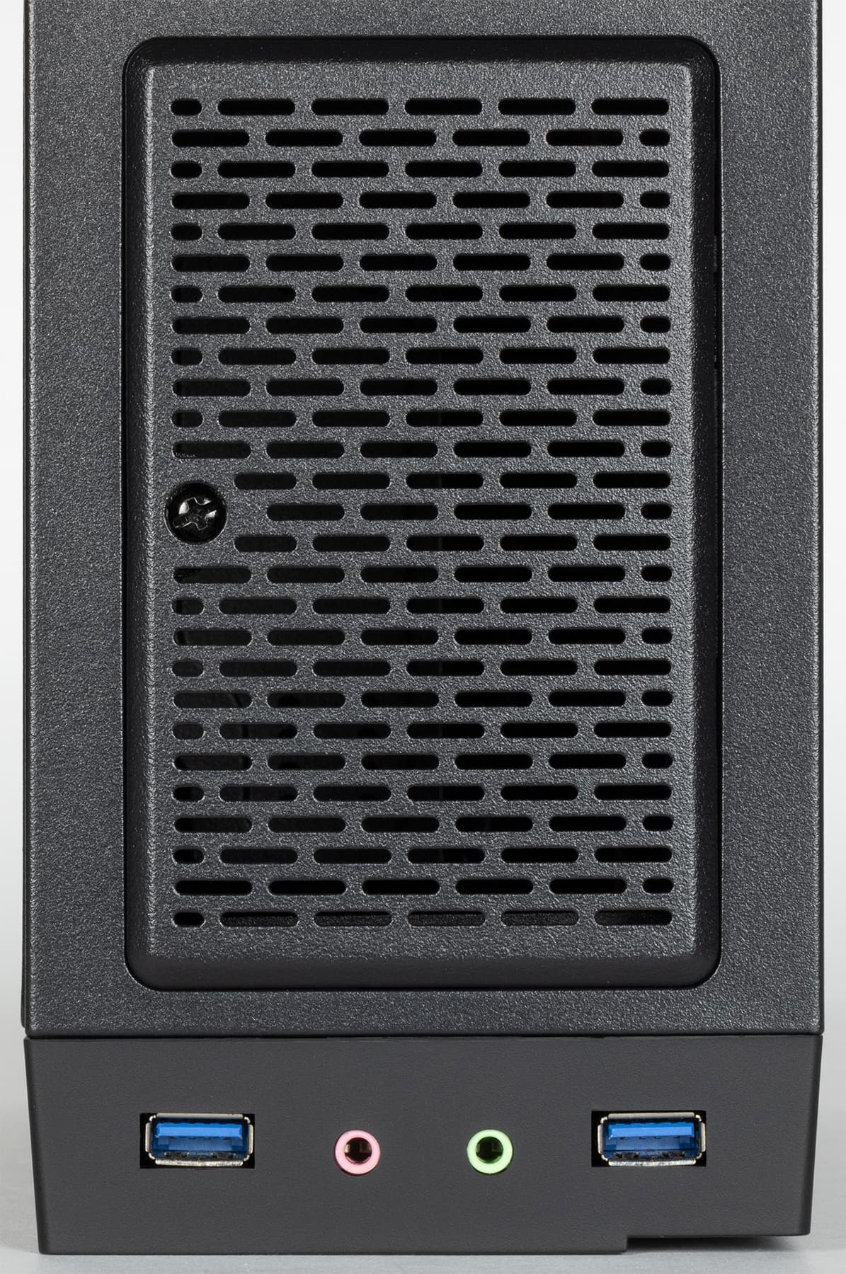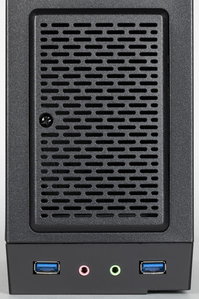 На верхнем торце (или с левой стороны при горизонтальной установке корпуса) передней панели размещены два порта USB 3.0 и стандартные разъемы для подключения микрофона и наушников.