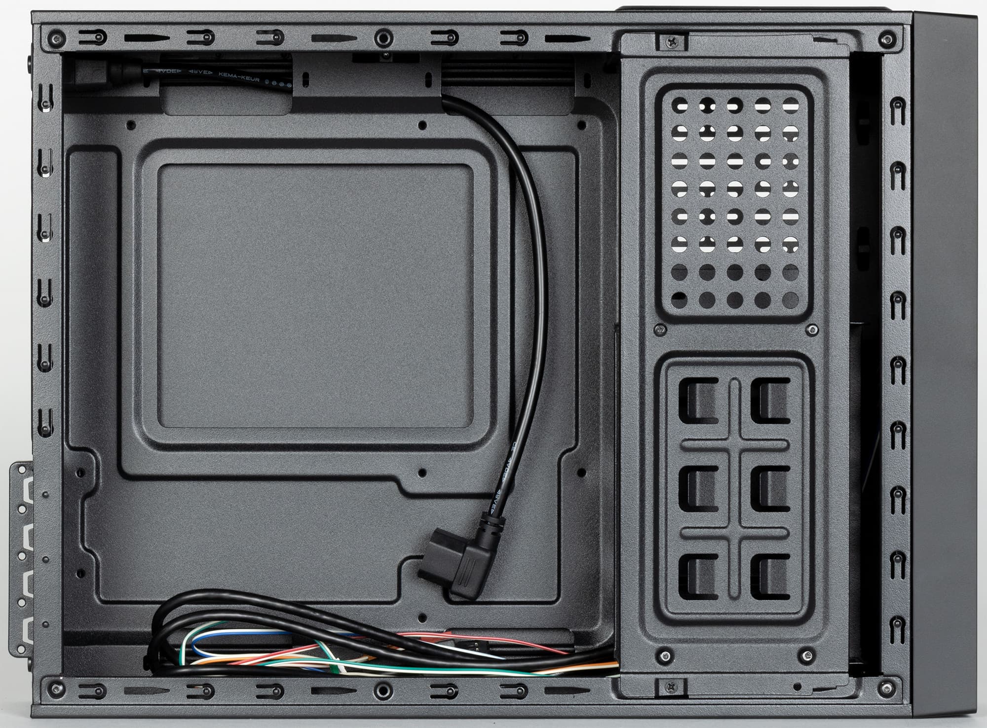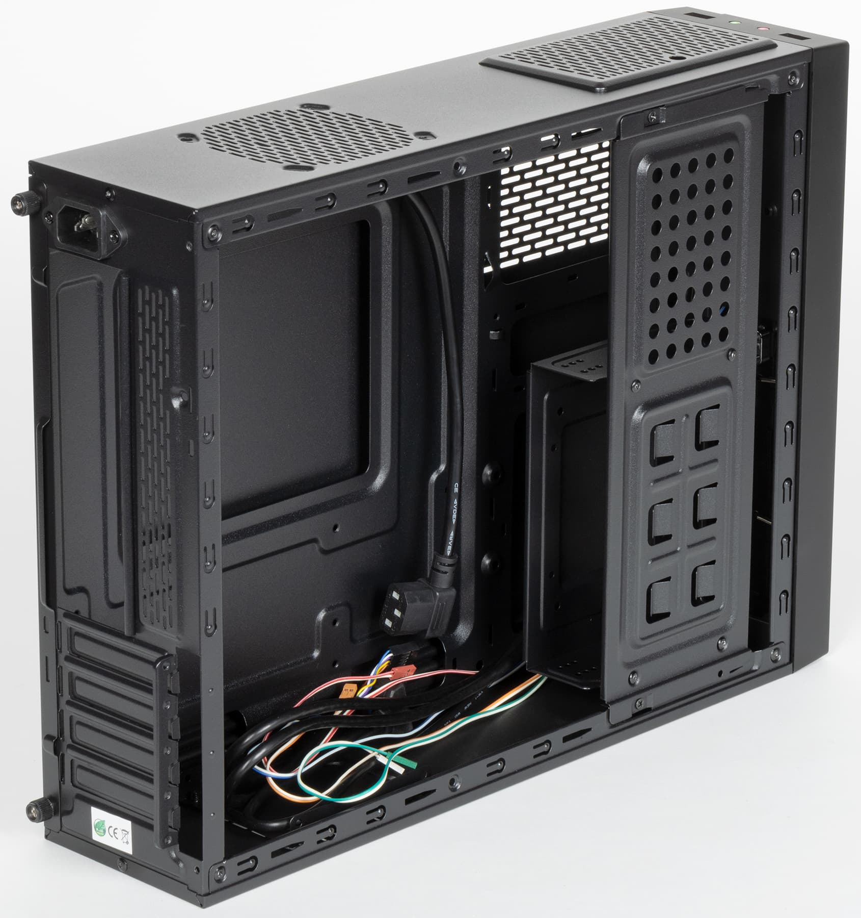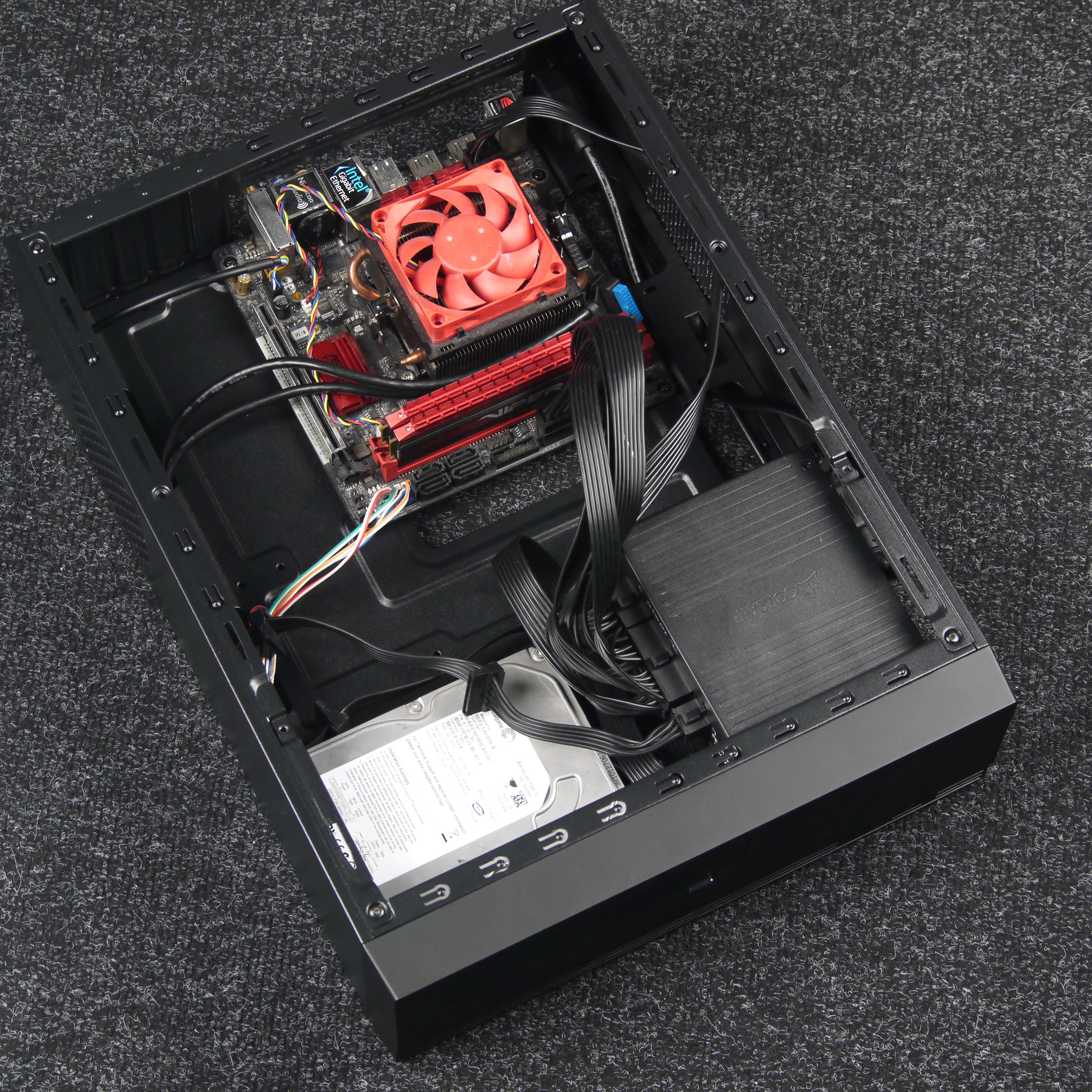 Компоновка элементов внутри корпуса больше похожа на компактный десктоп, так как именно для десктопа характерно размещение основных компонентов параллельно системной плате, при этом над системной платой со стороны кулера, как правило, никаких компонентов не размещено. Блок питания в таких корпусах размещается обычно сбоку или спереди, как правило с забором воздуха снизу или сбоку. В нашем случае БП формата SFX располагается спереди и имеет забор воздуха снизу (если расположить корпус горизонтально). Крепление у него отдельное — на винтах.