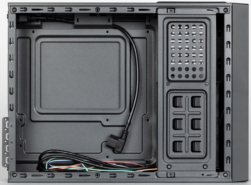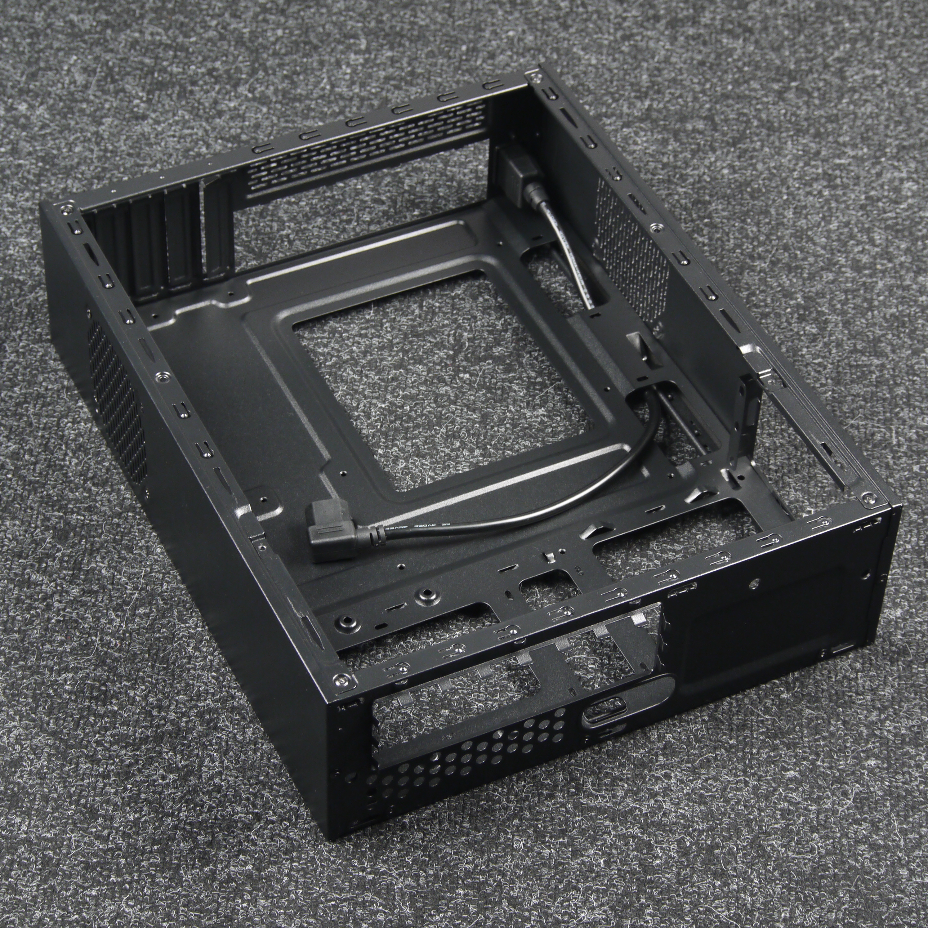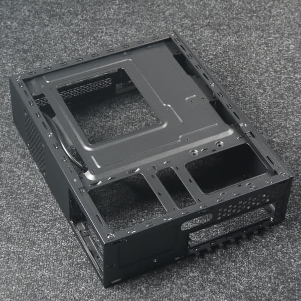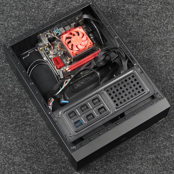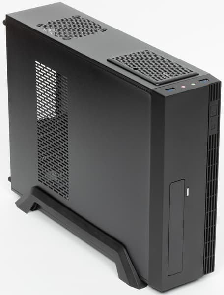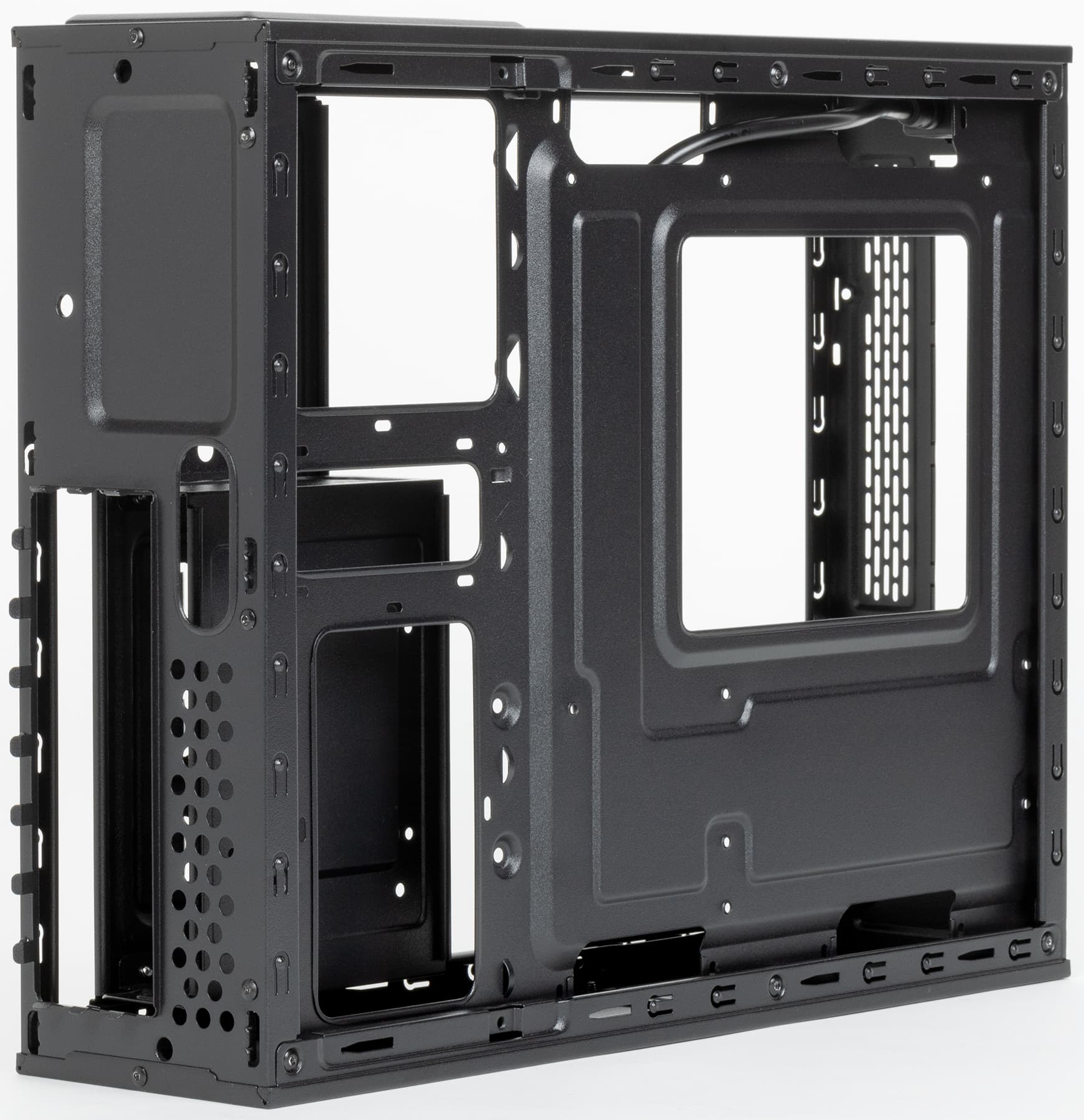 Компоновка элементов внутри корпуса больше похожа на компактный десктоп, так как именно для десктопа характерно размещение основных компонентов параллельно системной плате, при этом над системной платой со стороны кулера, как правило, никаких компонентов не размещено. Блок питания в таких корпусах размещается обычно сбоку или спереди, как правило с забором воздуха снизу или сбоку. В нашем случае БП формата SFX располагается спереди и имеет забор воздуха снизу (если расположить корпус горизонтально). Крепление у него отдельное — на винтах.