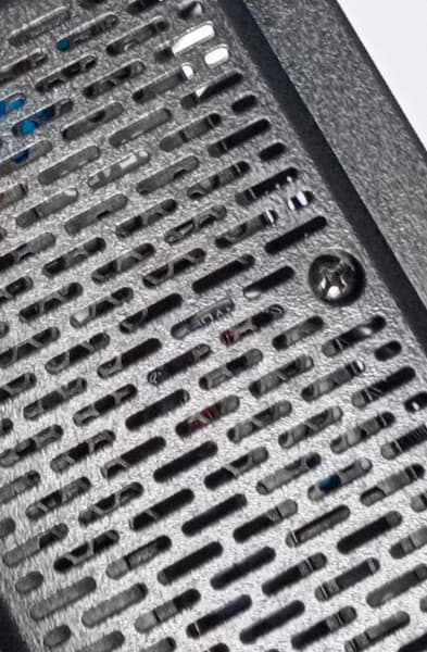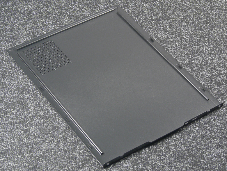 Для блока питания тоже предусмотрено два отверстия: приточное для воздухозабора на нижней стенке (на правой боковой в случае вертикальной установки) и вытяжное на боковой стенке (верхней в случае вертикальной установки). Последнее прикрыто стальной решеткой, которая фиксируется винтом. Решетка нужна не для очистки воздуха, как можно было бы подумать, а для защиты блока питания от падения на него мелких предметов.