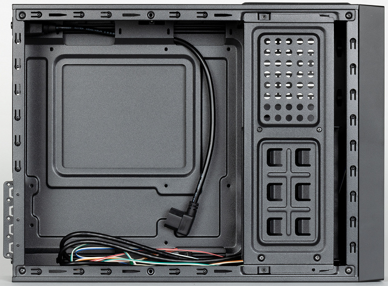 Стойки для крепления системной платы в корпусе не предустановлены. Гнезд с резьбой для стоек 9 штук, но в комплекте идет всего шесть стоек, то есть штатно корпус рассчитан на установку только зауженных плат microATX шириной до 220 мм (ну, или плат формата Mini-ITX). Качество исполнения резьбовых отверстий оставляет желать лучшего: с обратной стороны присутствуют вполне ощутимые заусенцы. Впрочем, для дешевых корпусов это вполне типичный недостаток.