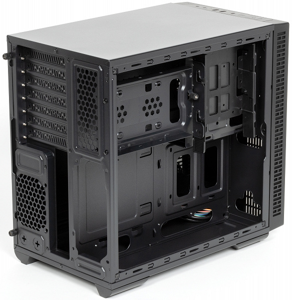 Компоновочные решения применены весьма оригинальные. За счет этого удалось создать корпус с компактными габаритами, хотя внутри может поместиться полноразмерная ATX-плата.