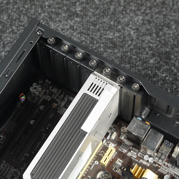 Система фиксации карточек — самая обычная: крепление на винтах с накатной головкой изнутри корпуса с индивидуальной фиксацией. Все заглушки для плат расширения многоразовые и фиксируются винтами.