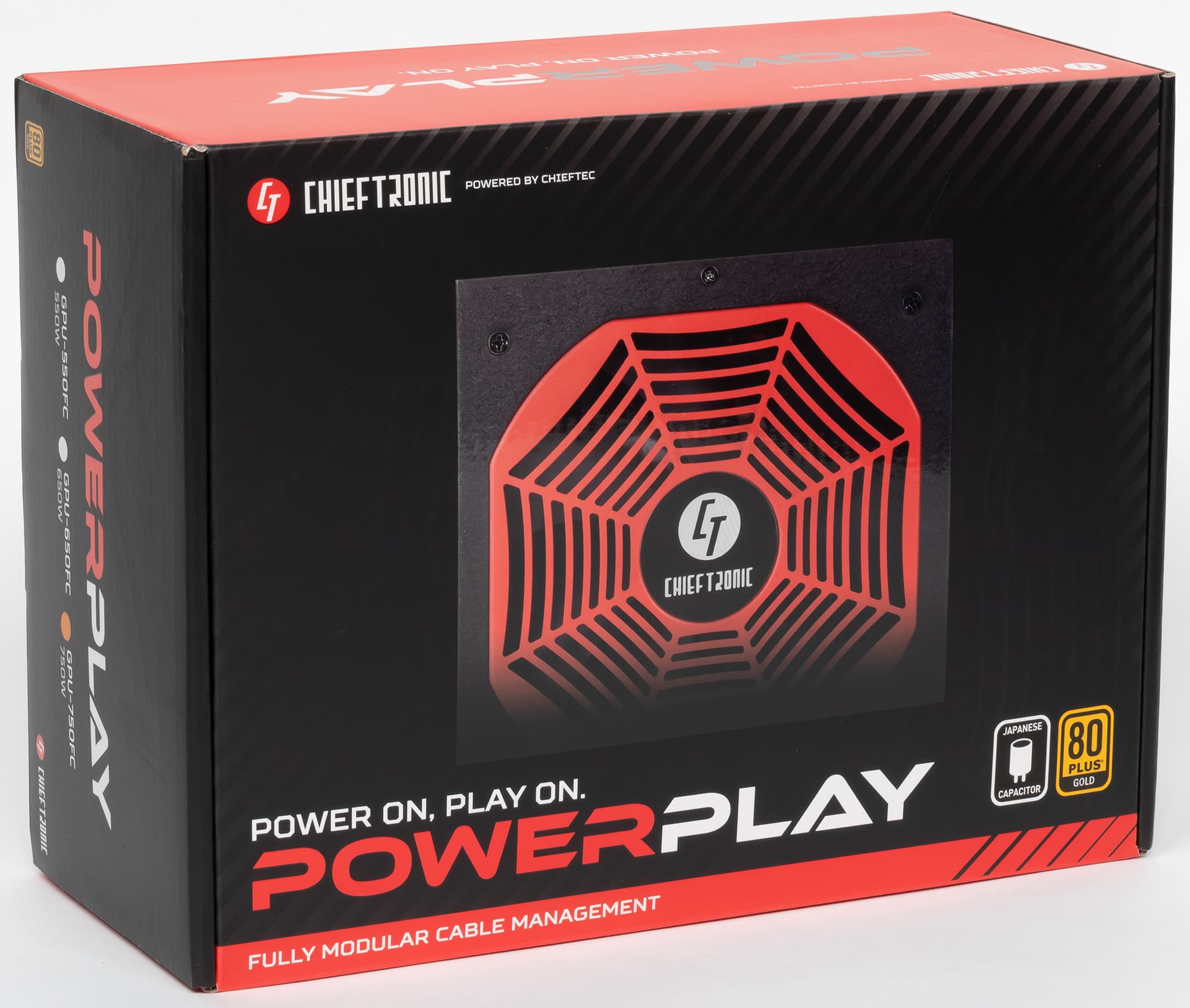 Блоки питания под маркой Chieftronic представлены двумя сериями: PowerPlay Gold и PowerPlay Platinum. В серии PowerPlay Gold предлагаются три модели мощностью 550, 650 и 750 Вт, все они имеют сертификат 80Plus Gold. С младшей моделью мы уже знакомы, теперь нам предстоит познакомиться со старшей — блоком питания Chieftronic PowerPlay 750W (GPU-750FC). В российской рознице на момент публикации обзора он стоил около 7500 рублей.