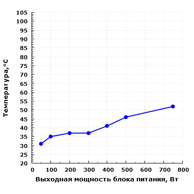 Также стоит учитывать, что в случае работы с остановленным вентилятором температура компонентов внутри БП сильно зависит от окружающей температуры воздуха, и если та установится на уровне 40-45 °C, это приведет к более раннему включению вентилятора.