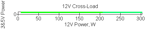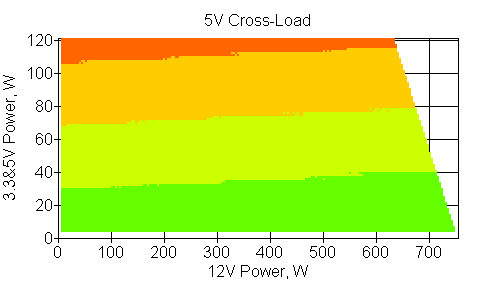 Следующим этапом инструментального тестирования является построение кросснагрузочной характеристики (КНХ) и представление ее на четвертьплоскости, ограниченной максимальной мощностью по шине 3,3&5 В с одной стороны (по оси ординат) и максимальной мощностью по шине 12 В с другой (по оси абсцисс). В каждой точке измеренное значение напряжения обозначается цветовым маркером в зависимости от отклонения от номинального значения.
