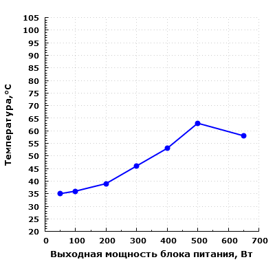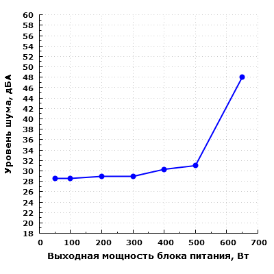При нагрузке в 650 Вт вентилятор начинает работать в гораздо более производительном режиме, шум блока питания сильно возрастает и уже подбирается к 50 дБА при условии настольного размещения, то есть при расположении блока питания в ближнем поле по отношению к пользователю. Подобный уровень шума можно охарактеризовать как очень высокий. Надо заметить, что подавляющее большинство современных источников питания, особенно бюджетных, имеют высокий уровень шума при работе на максимальной мощности, так что ничего неожиданного тут нет.