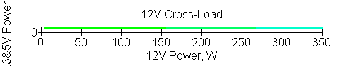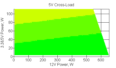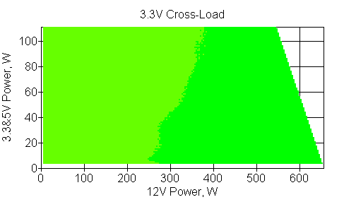 Следующим этапом инструментального тестирования является построение кросснагрузочной характеристики (КНХ) и представление ее на четвертьплоскости, ограниченной максимальной мощностью по шине 3,3&5 В с одной стороны (по оси ординат) и максимальной мощностью по шине 12 В с другой (по оси абсцисс). В каждой точке измеренное значение напряжения обозначается цветовым маркером в зависимости от отклонения от номинального значения.