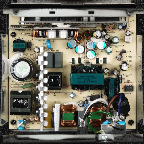 Высоковольтные силовые элементы, за исключением входной диодной сборки, установлены на одном радиаторе. Транзисторы синхронного выпрямителя установлены с оборотной стороны основной печатной платы, а с лицевой стороны имеются теплорассеиватели. Элементы импульсных преобразователей каналов +3.3VDC и +5VDC размещены на дочерней печатной плате, установленной вертикально, и, по традиции, дополнительных теплоотводов не имеют — это вполне типично для блоков питания с активным охлаждением.