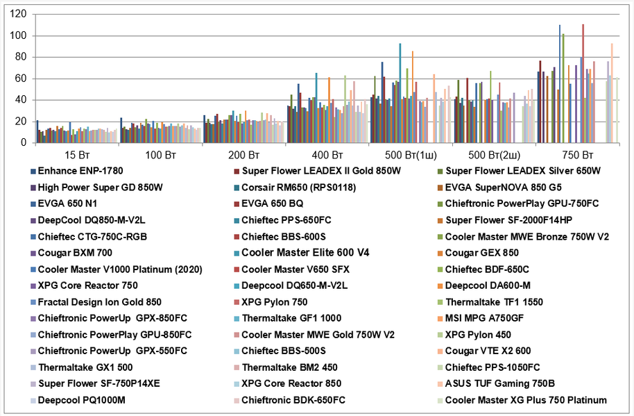| Super Flower Leadex Silver 650W | 10,9 | 15,1 | 22,8 | 45 | 62,5 | 59,2 | |