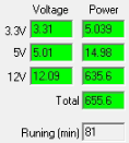 | Нагрузка через разъемы | 12VDC, Вт | 5VDC, Вт | 3.3VDC, Вт | Общая мощность, Вт |