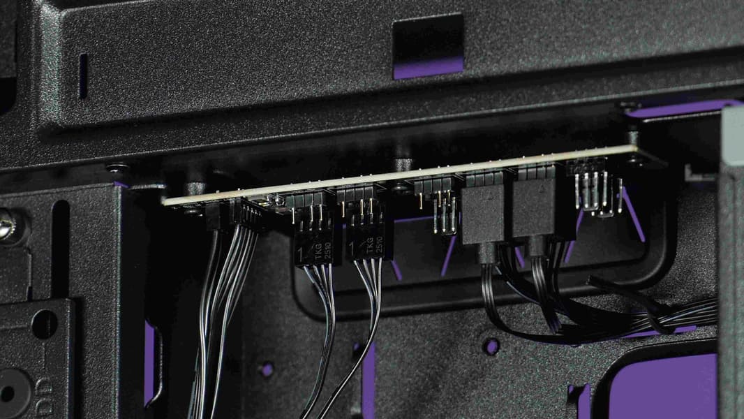 Все вентиляторы подключены через хаб, который, в свою очередь, подключается к контроллеру и к системной плате. От контроллера на хаб поступает сигнал управления подсветкой, а от системной платы (с одного из разъемов управления вентиляторами) — сигнал ШИМ для управления скоростью вращения вентиляторов.