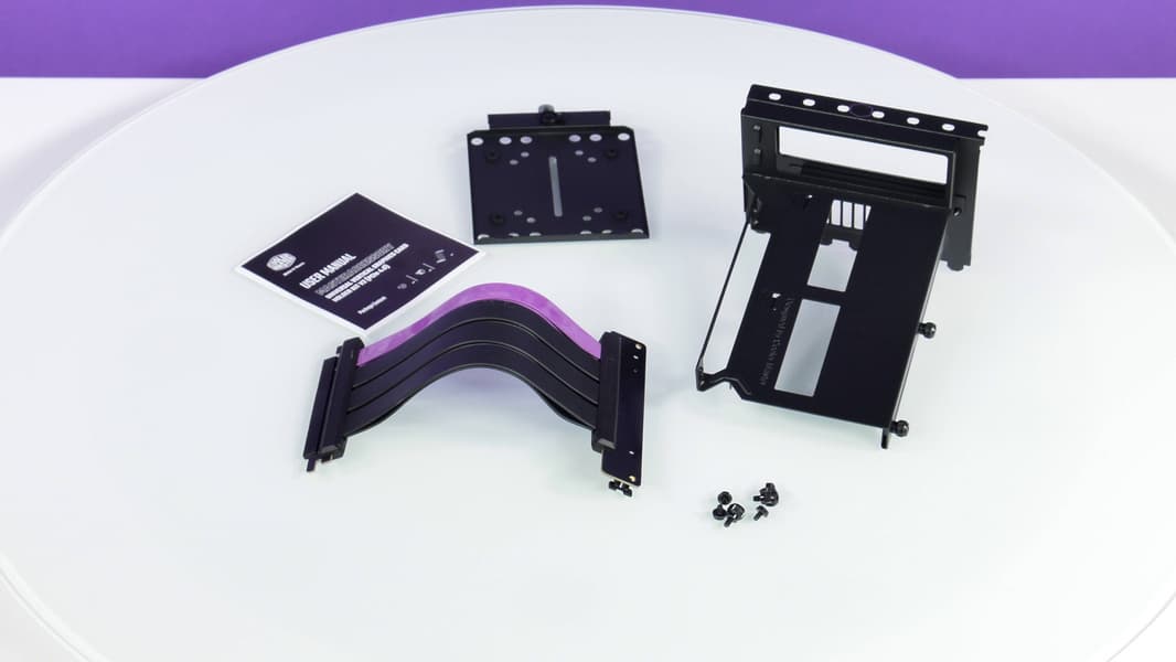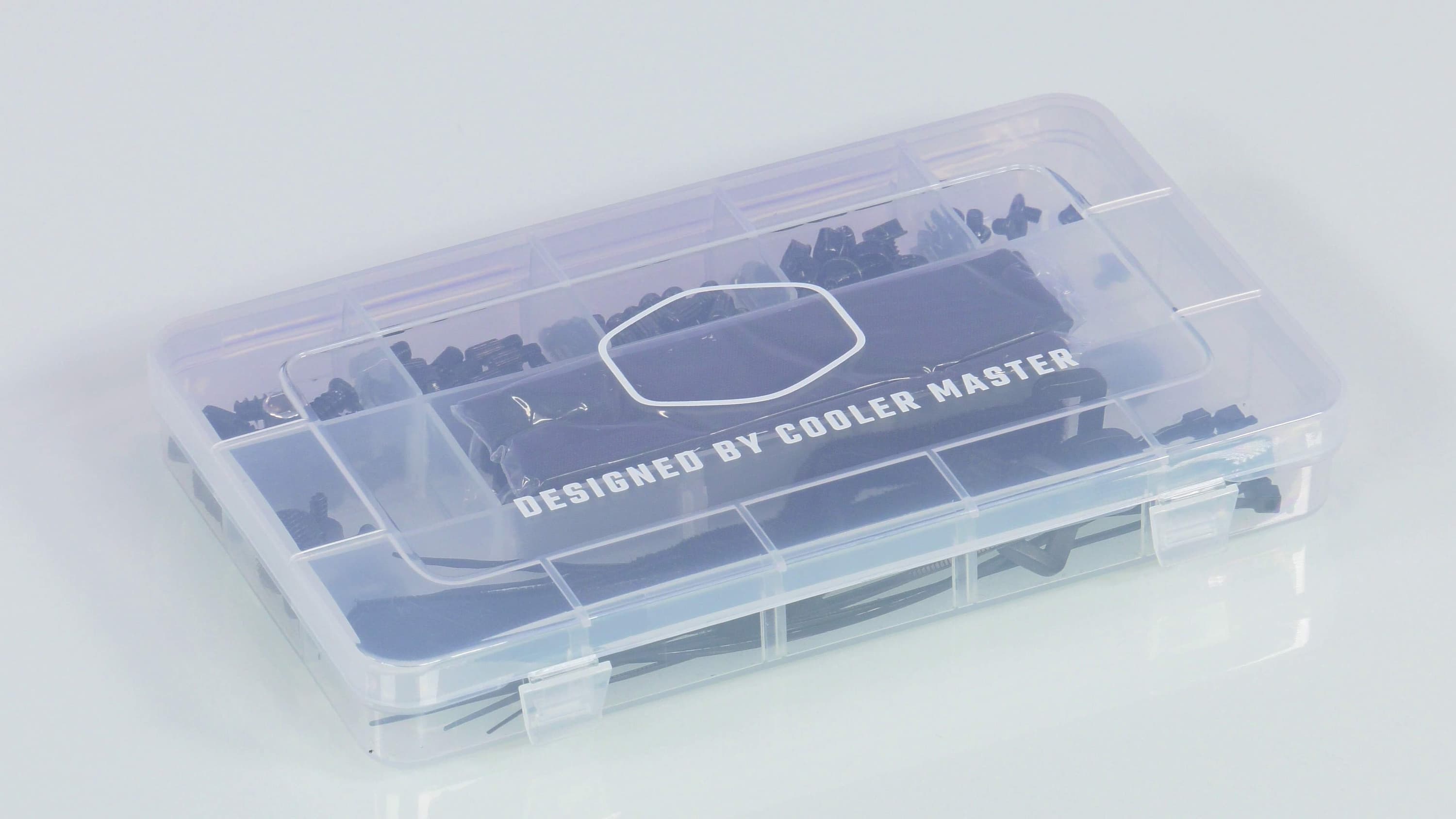 Комплект поставки уложен в отдельную картонную коробку, размещенную внутри корпуса. Отметим, что в комплекте есть удлинительный кабель для видеокарты (райзер). Винты прилагаются в пластиковом органайзере, в котором они отсортированы по типам, что очень удобно.