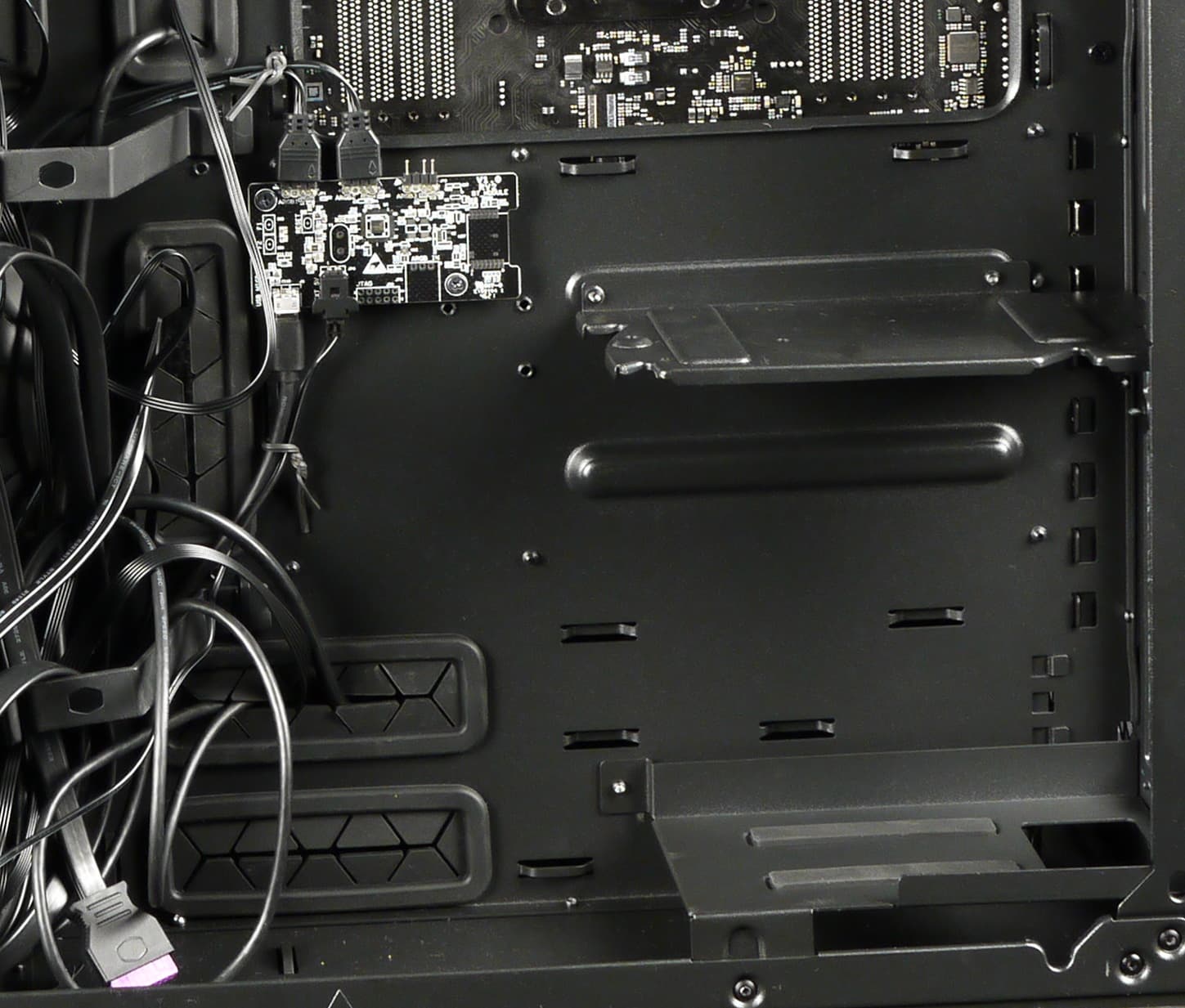 Еще один момент: далеко не на всех платах есть два разъема, которые нужны для подключения четырех портов USB на корпусе. Поэтому здесь было бы желательно увидеть внешний блок с подключением к слотам PCIe (или к задним портам системной платы) или, в качестве альтернативного решения, внутренний контроллер USB 3.0, что увеличило бы удобство использования корпуса.