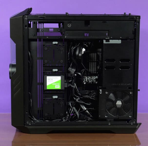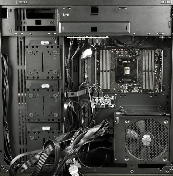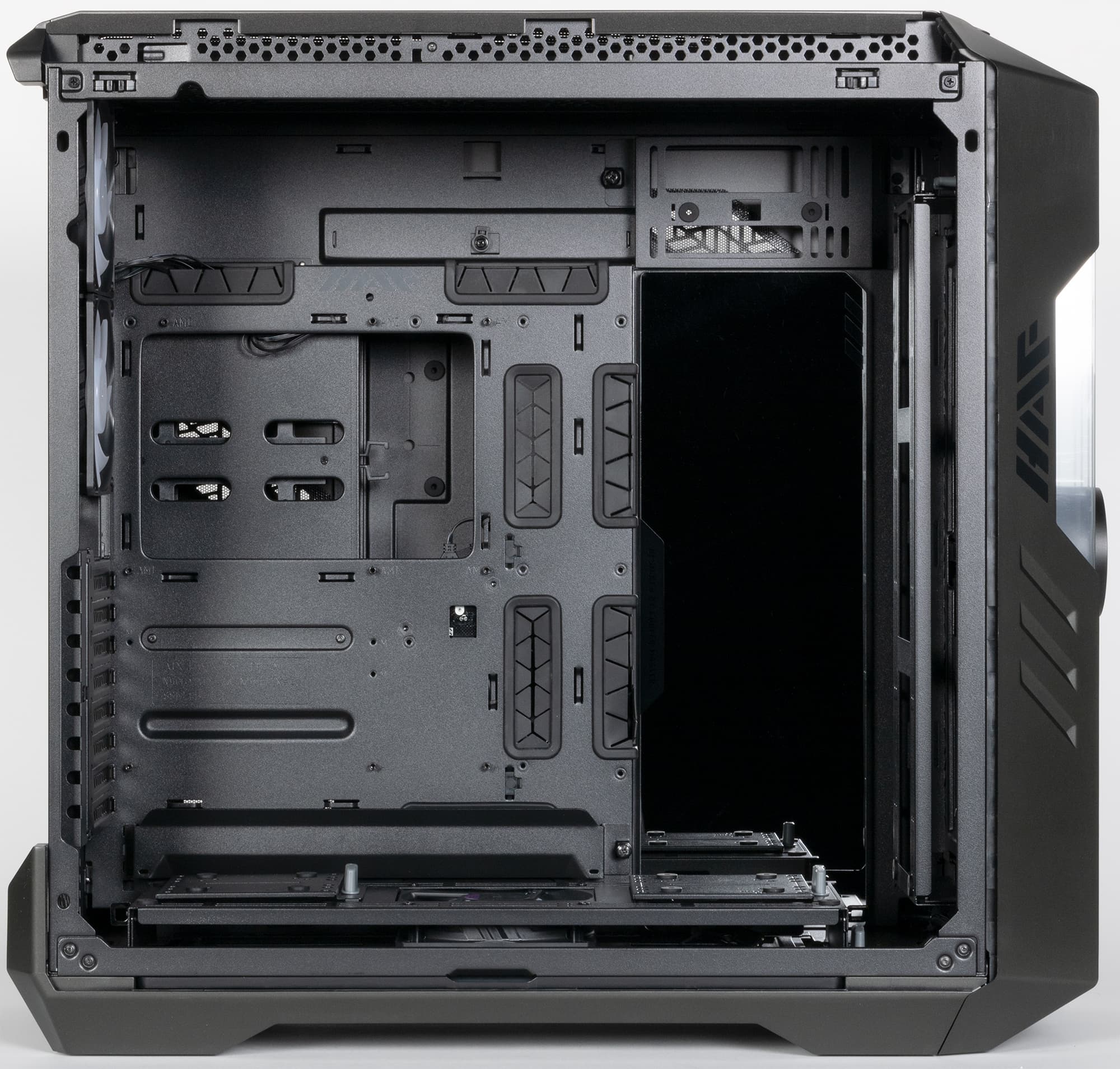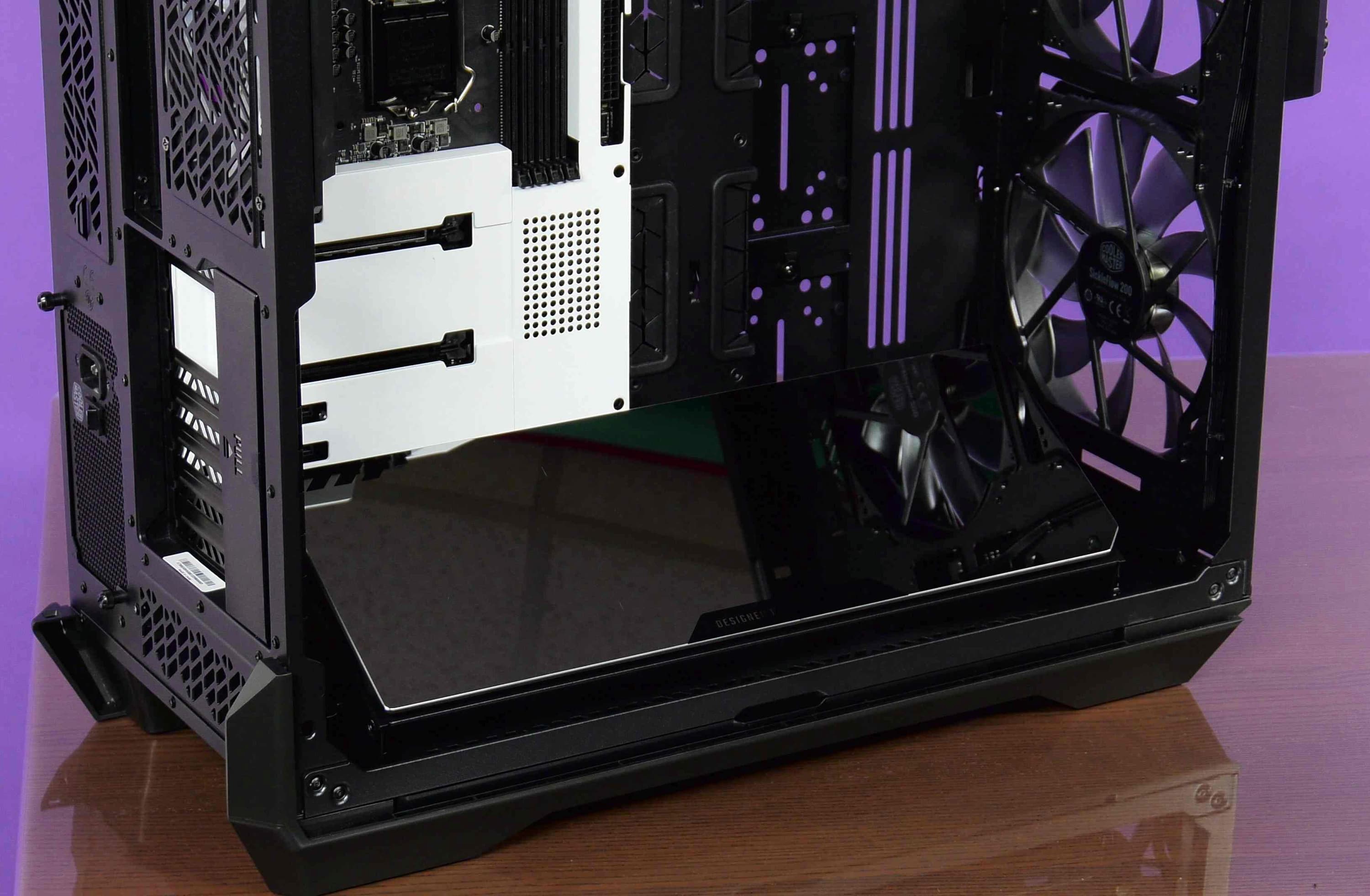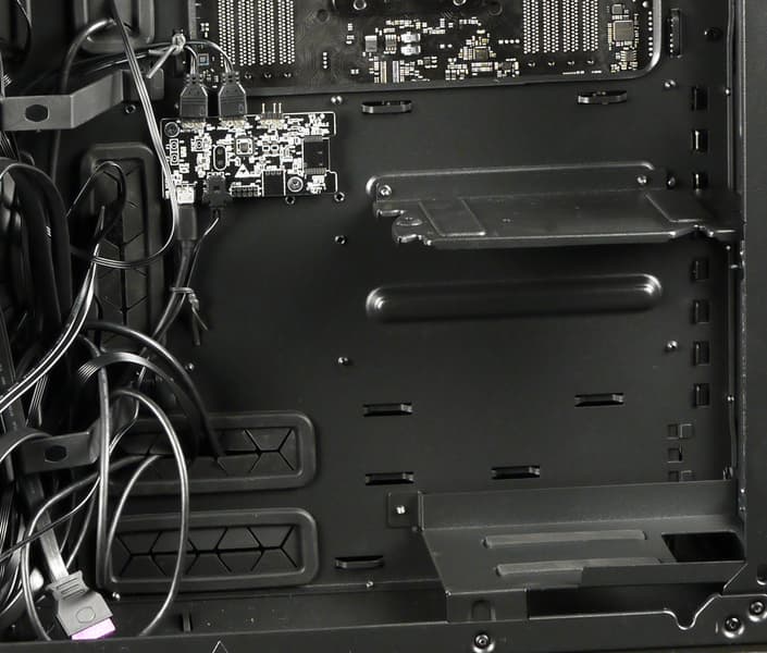 Вообще, внутренний объем корпуса разделен основанием для системной платы, с его обратной стороны находятся посадочные места для накопителей и блока питания и остается много места для проводов.