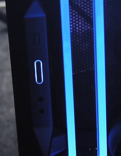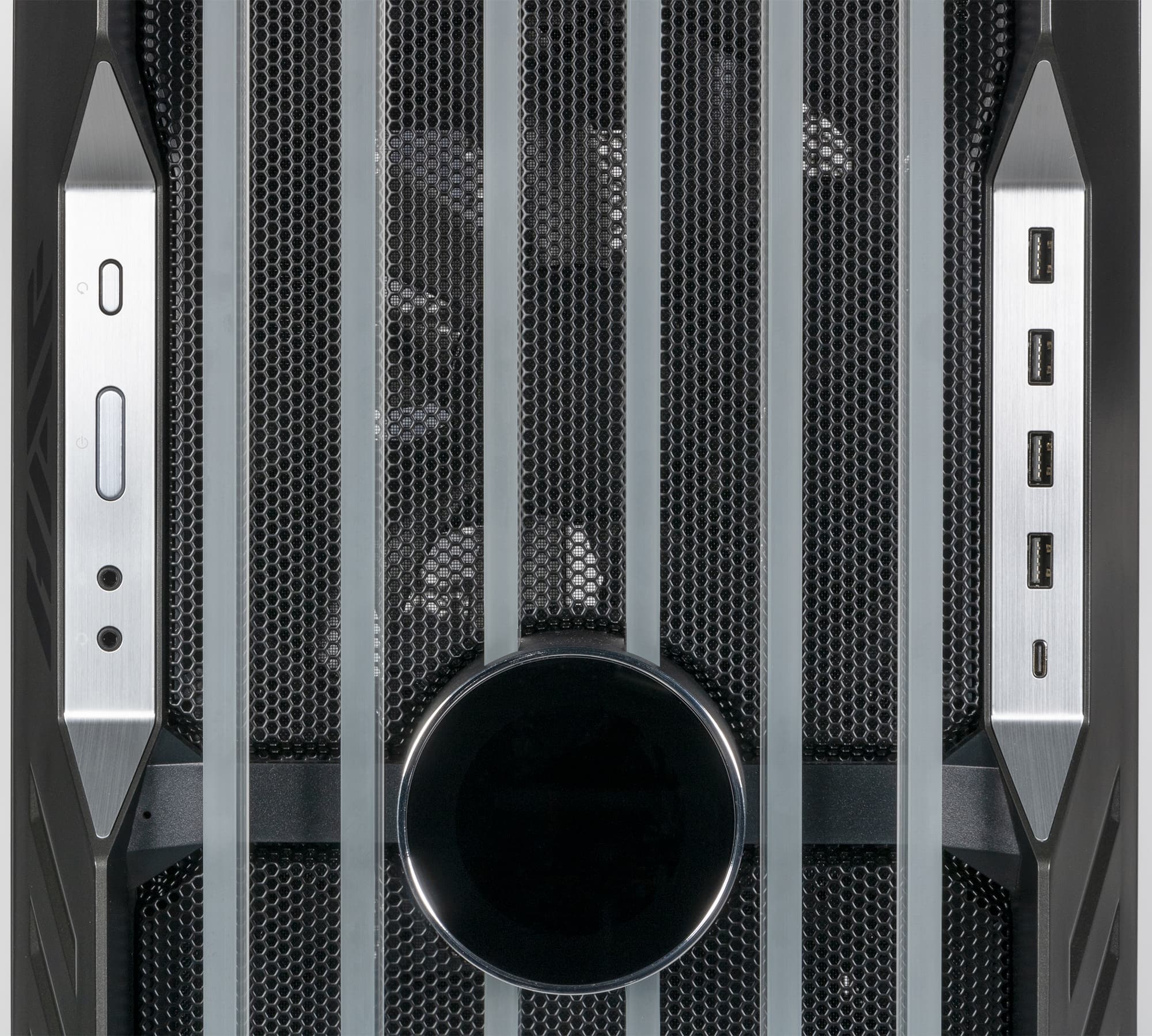 На передней панели размещены кнопки и интерфейсные разъемы: четыре порта USB 3.0, один порт USB3 Gen2 (USB 3.1) Type-C, отдельные разъемы для подключения микрофона и наушников. Можно только приветствовать наличие четырех разъемов USB 3.0 типа A, но размещены они не самым удобным образом: в один ряд с правой стороны передней панели, причем ближе к середине по высоте корпуса. Видимо, предполагается, что корпус будет все-таки стоять на столе.
