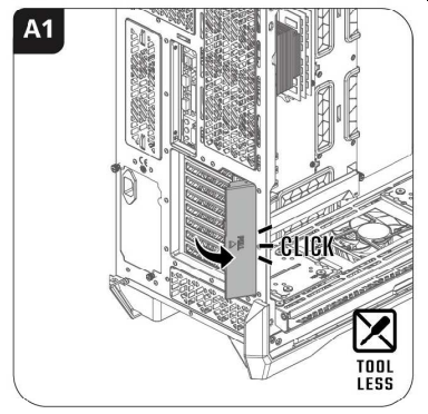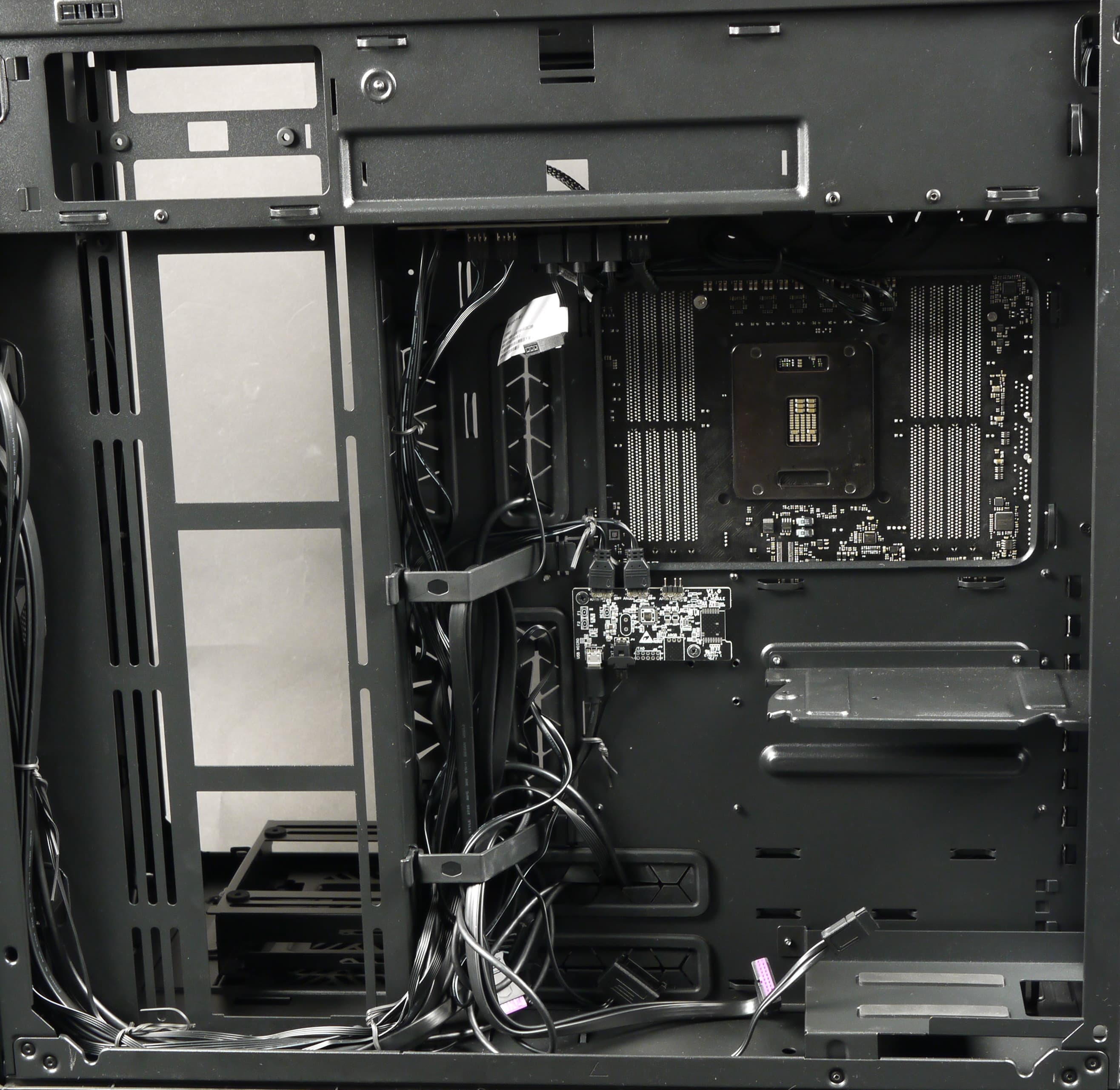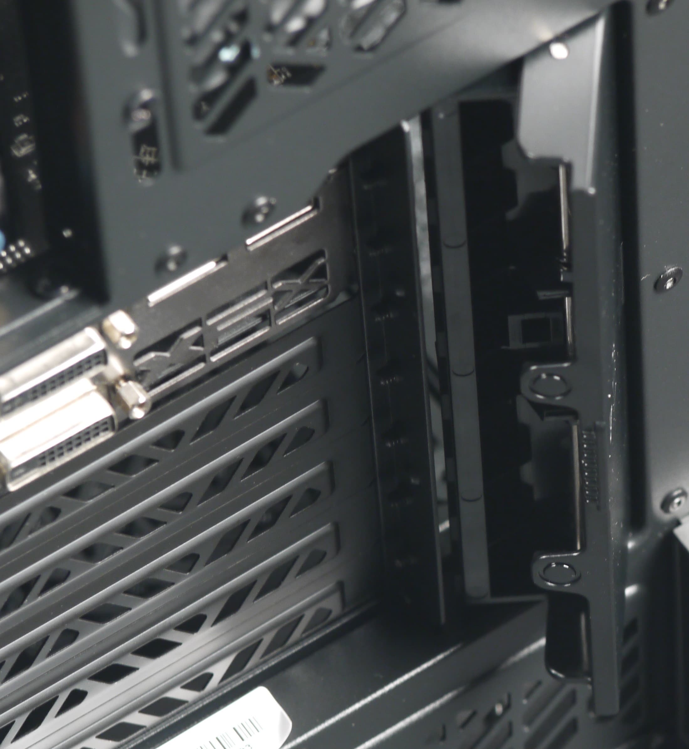 Далее можно установить требуемые платы расширения, например видеокарту, которая может достигать в длину до 490 мм, по заявлению производителя. Расстояние между бортами шасси составляет около 520 мм, так что действительно можно установить очень длинную видеокарту.