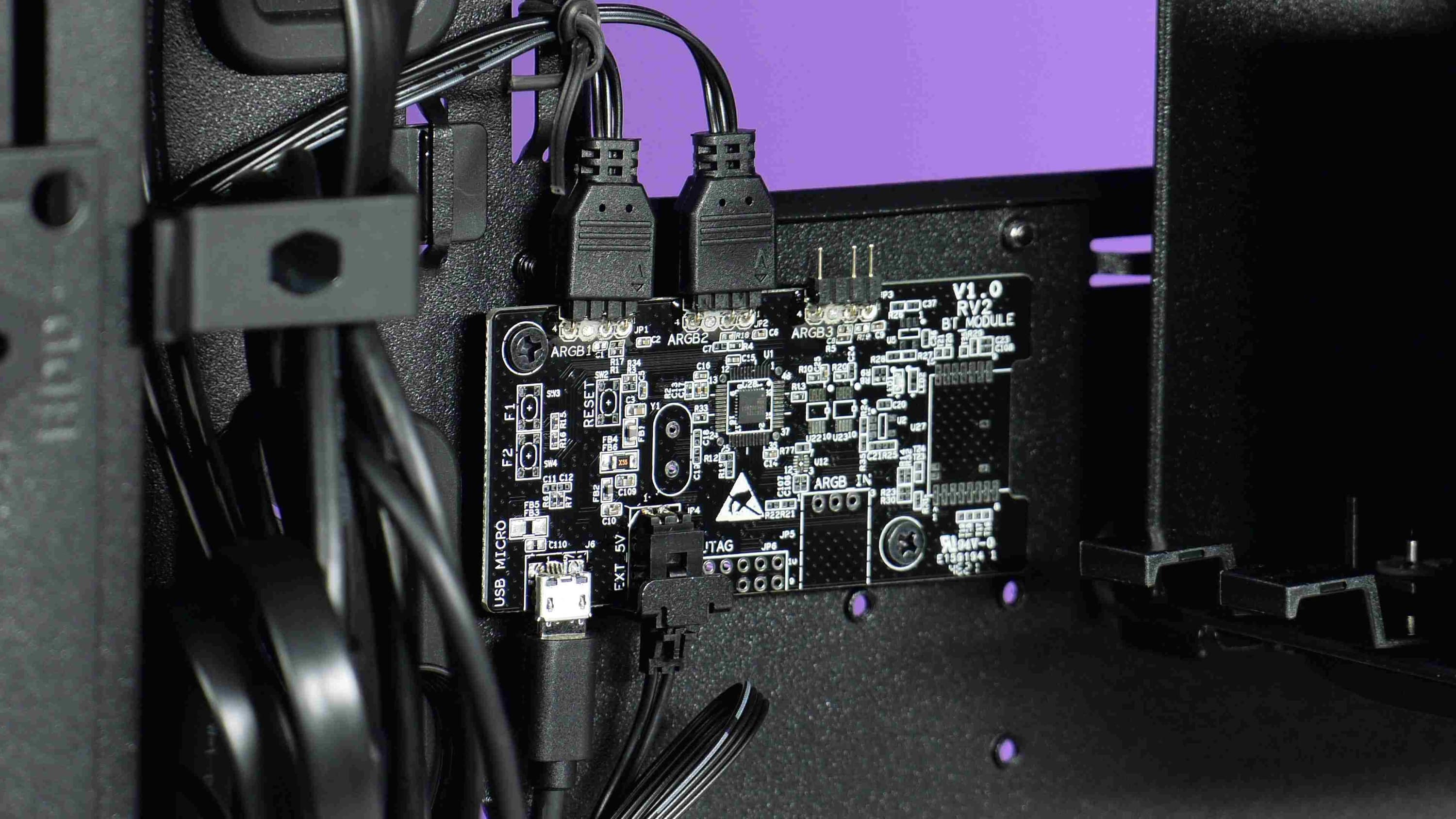 В качестве источников света в корпусе установлены три вентилятора с ARGB-подсветкой и блок светодиодов в передней панели (они излучают через оригинальный световод).