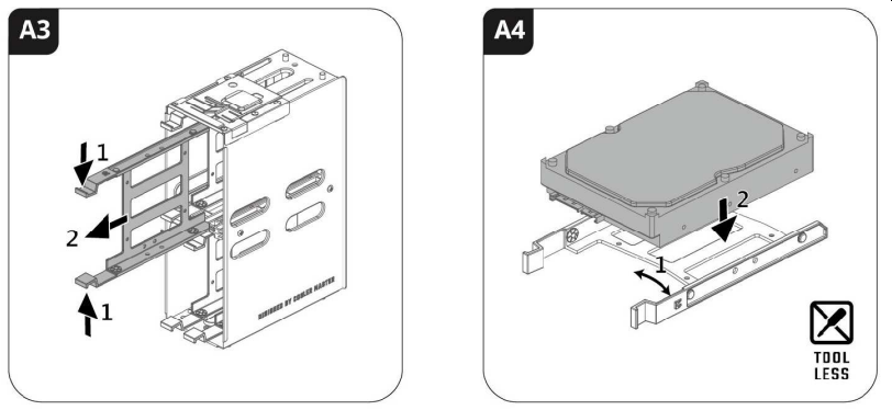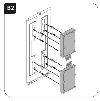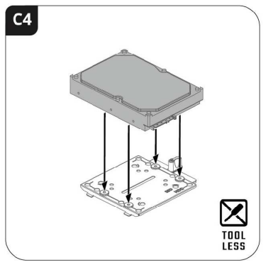 В корзине имеется четыре универсальные монтажные рамки, позволяющие установить по одному накопителю типоразмера 2,5 или 3,5 дюйма.