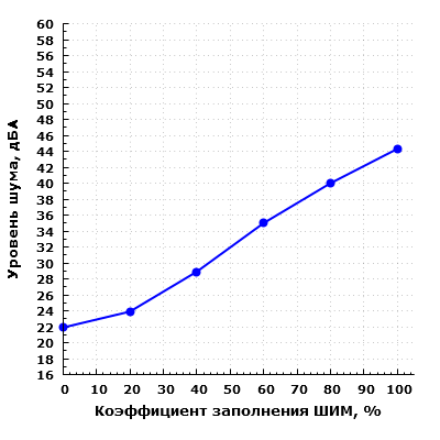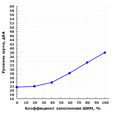 Мы провели измерения уровня шума системы охлаждения корпуса при изменении коэффициента заполнения ШИМ от 0 до 100% с шагом 20%.