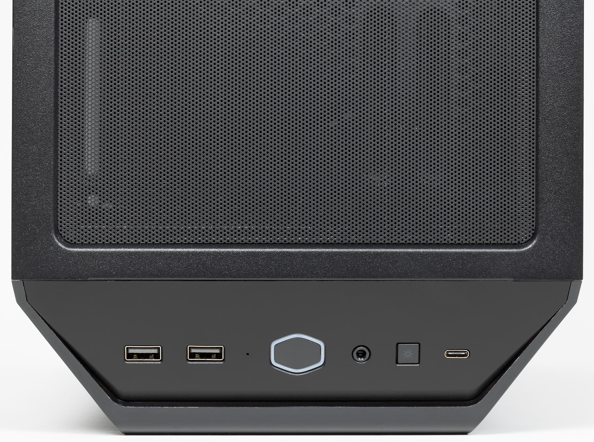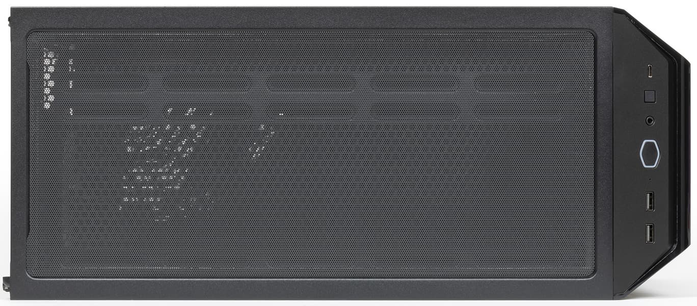 Передняя панель переходит в верхнюю через скошенную площадку (конструкционно это верхняя панель), на которой размещены кнопки и интерфейсные разъемы: два порта USB 3.0, один порт USB3 Gen 2 (USB 3.1) Type-C, комбинированный разъем для подключения микрофона и наушников или гарнитуры. Таким образом, корпус позволяет подключать проводные гарнитуры как с цифровым, так и с аналоговым интерфейсом со стороны передней панели. Но разъемов USB все-таки хотелось бы видеть чуть больше, двух разъемов (типа A) не всегда достаточно для оперативного подключения периферийного оборудования.