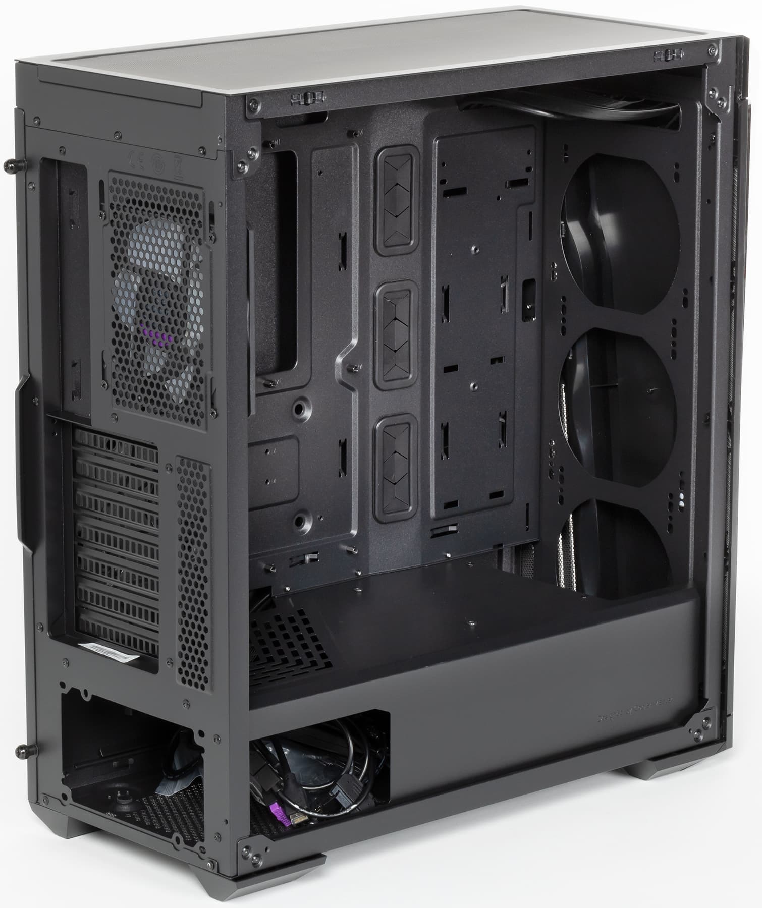 Компоновочные решения данной модели определяются современными тенденциями корпусостроения. В данном случае разработчики отказались от отсека для устройств формата 5,25″, а привычный отсек для устройств 3,5″ расположен около передней стенки шасси, но присутствует он в усеченном виде, всего на два диска, и снять его нельзя.