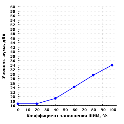Мы провели измерения уровня шума системы охлаждения корпуса при изменении коэффициента заполнения ШИМ от 0 до 100% с шагом 20%.