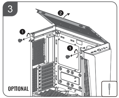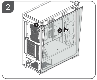 Стенка из закаленного стекла фиксируется при помощи сферических распорных элементов сверху, зацепа снизу и одного винта с накатной головкой, который вкручивается традиционно — в заднюю стенку корпуса. После откручивания винта стенка не отваливается сама собой — для извлечения ее нужно отклонить от корпуса, преодолев усилие распорных элементов.