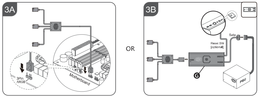 Вентилятор имеет два разъема: стандартный четырехконтактный с возможностью подключения к системной плате с управлением ШИМ и стандартный трехконтактный разъем c колодкой 1×4 (ARGB) для управления подсветкой.