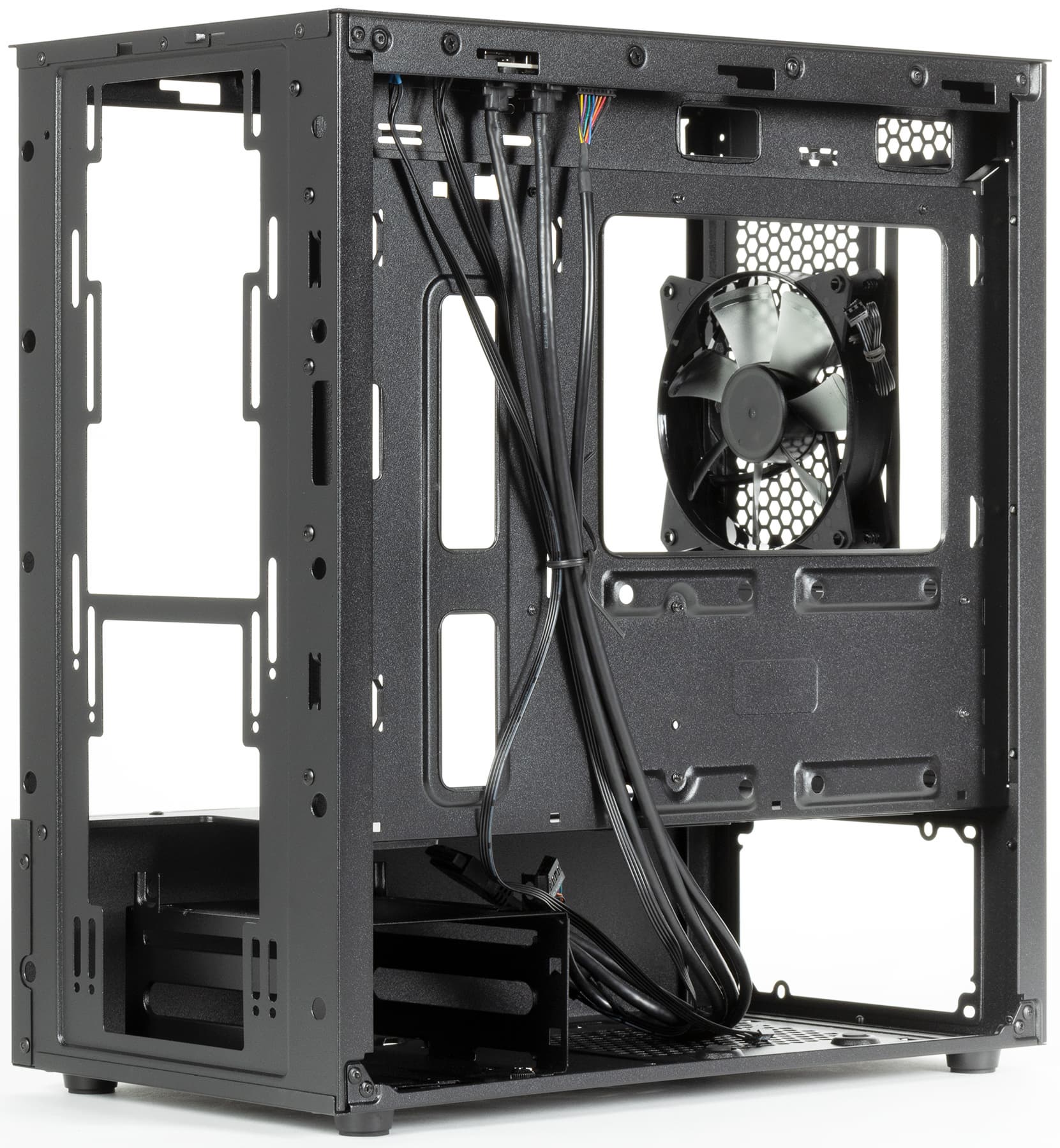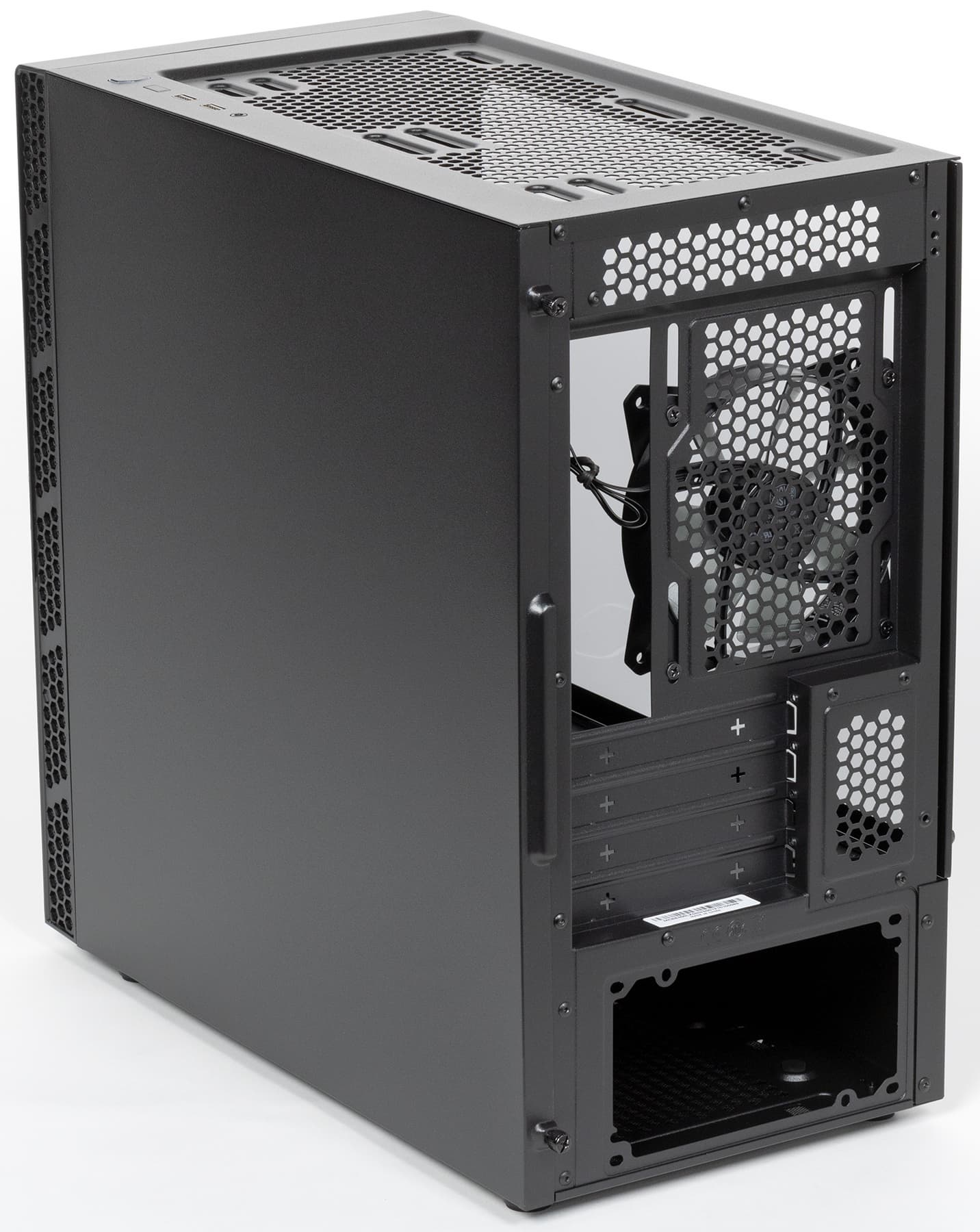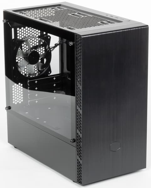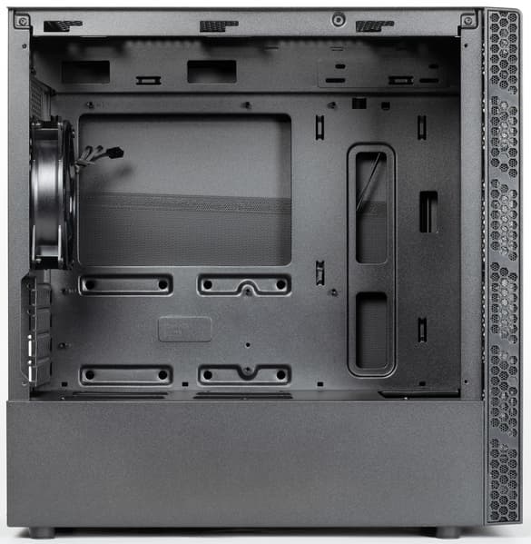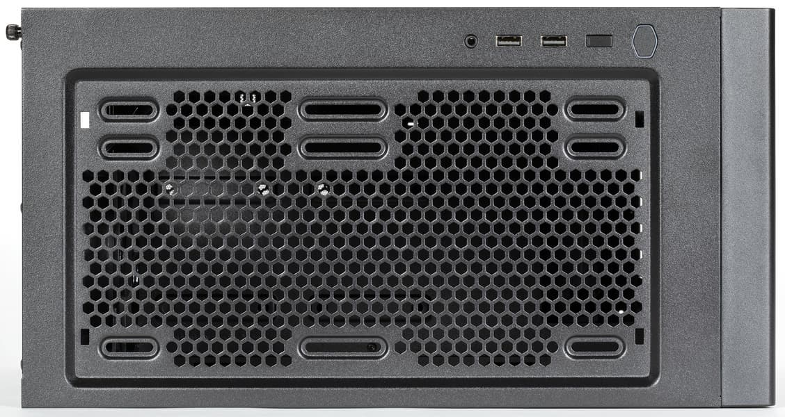Достигается низкий уровень шума благодаря использованию одного низкоскоростного вентилятора, установленного сзади. Для большинства недорогих конфигураций этого будет вполне достаточно, особенно с учетом наличия верхнего выхлопа. При сборке системы с высоким тепловыделением корпус можно оснастить вентилятором сверху, который обеспечит улучшенный теплоотвод, а также заменить задний вентилятор на более производительный, и лучше на модель с ШИМ-управлением.