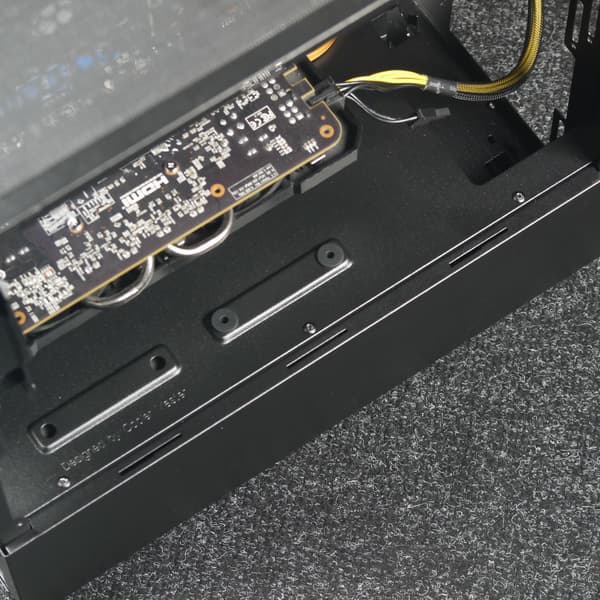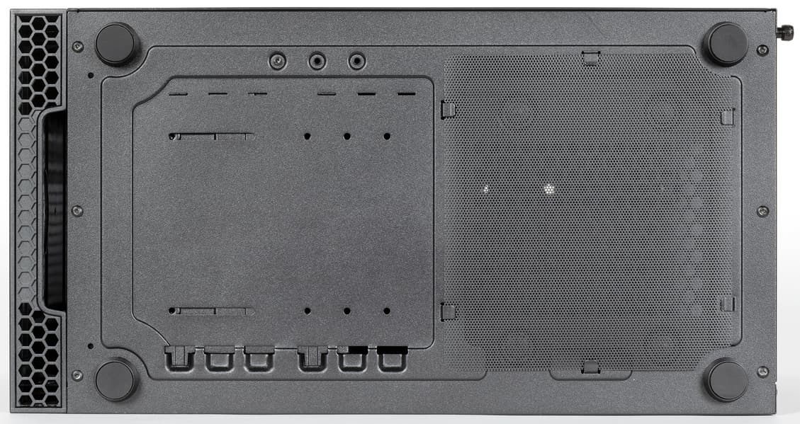 Стоит отметить, что в данном корпусе кожух — не внутренний компонент, располагающийся между боковыми панелями, как в большинстве подобных решений. Он является одной из частей левой стенки, формируя, вместе со съемной панелью, внешнюю боковую поверхность корпуса. Подобное техническое решение позволило уменьшить площадь съемной боковой панели, снизив и себестоимость корпуса. С точки зрения эксплуатации такой вариант тоже имеет свои плюсы в случае напольного расположения корпуса: стальную стенку сложнее повредить, случайно задев ее ногой.