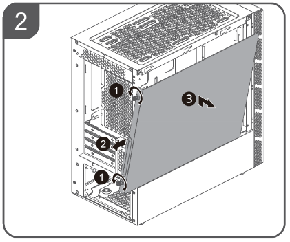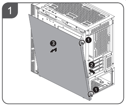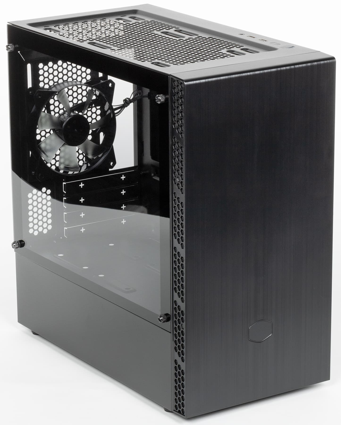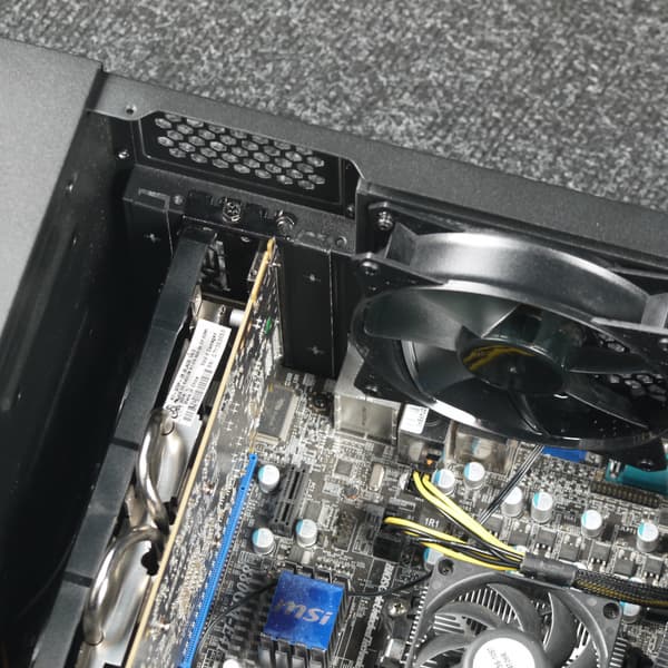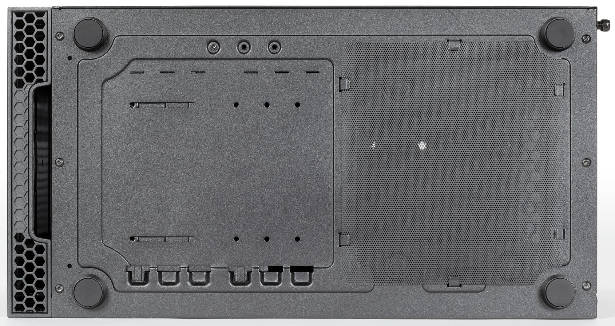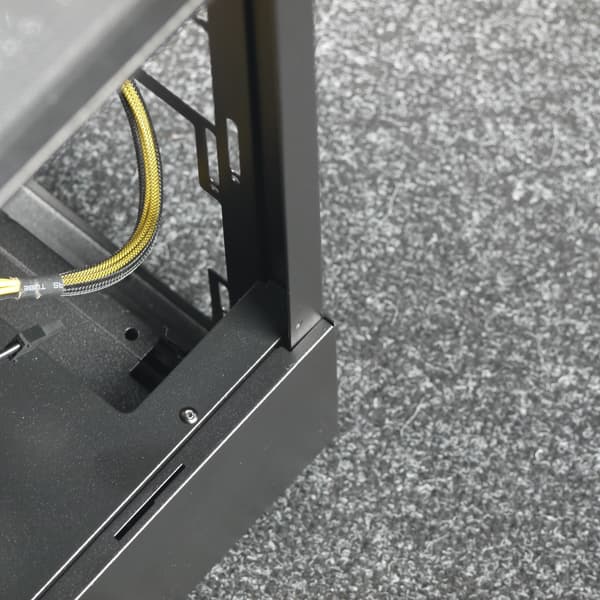Левая стенка корпуса имеет оригинальную конструкцию: она состоит из двух частей. Нижняя часть — стационарная стальная, а в верхней части установлена съемная панель, выполненная в случае нашей модификации из закаленного стекла. Фиксируется панель при помощи четырех винтов с накатной головкой, винты выполнены невыпадающими. Система крепления — накладного типа: винты вставлены через отверстия в панели.