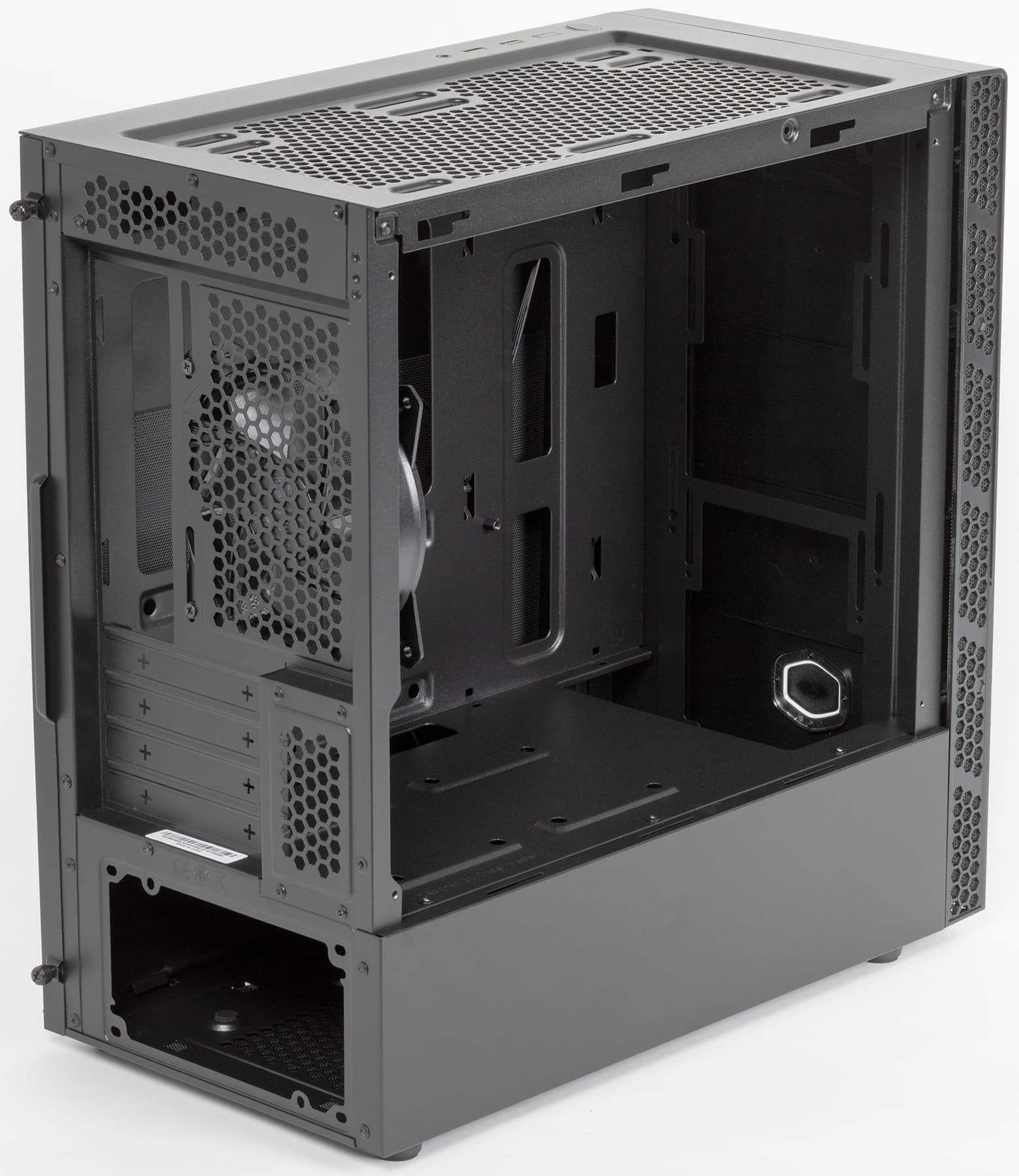 В целом, жесткость корпуса на скручивание можно считать если и не высокой, то вполне приличной, особенно в собранном состоянии. Этому сильно способствует частично несъемная левая стенка и стеклянная панель, а также относительно небольшая высота корпуса. Масса пустого корпуса составляет 4,84 кг.