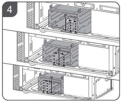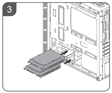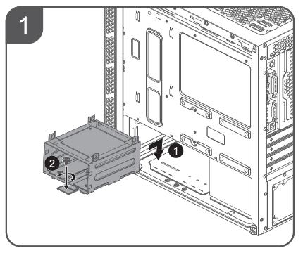 Полноразмерные жесткие диски устанавливаются в предназначенную для них двухместную корзину. Фиксируется корзина при помощи одного винта и зацепов с противоположной стороны. Корзина съемная.