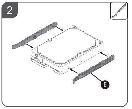 Крепление накопителей в корзине осуществляется при помощи салазок. В случае салазок никаких амортизирующих элементов не предусмотрено, если не считать небольшие прокладки из силикона в местах прижатия диска к планке салазок около штыря.