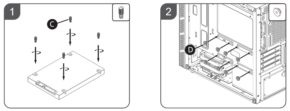 Стоит учитывать, что в комплекте есть только восемь втулок и соответствующих винтов, то есть набор рассчитан на установку только двух дисков из четырех возможных. В случае SSD формата 2,5 дюйма можно использовать двухточечное крепление, если системный блок не планируется никуда перемещать. В общем, экономия на спичках.