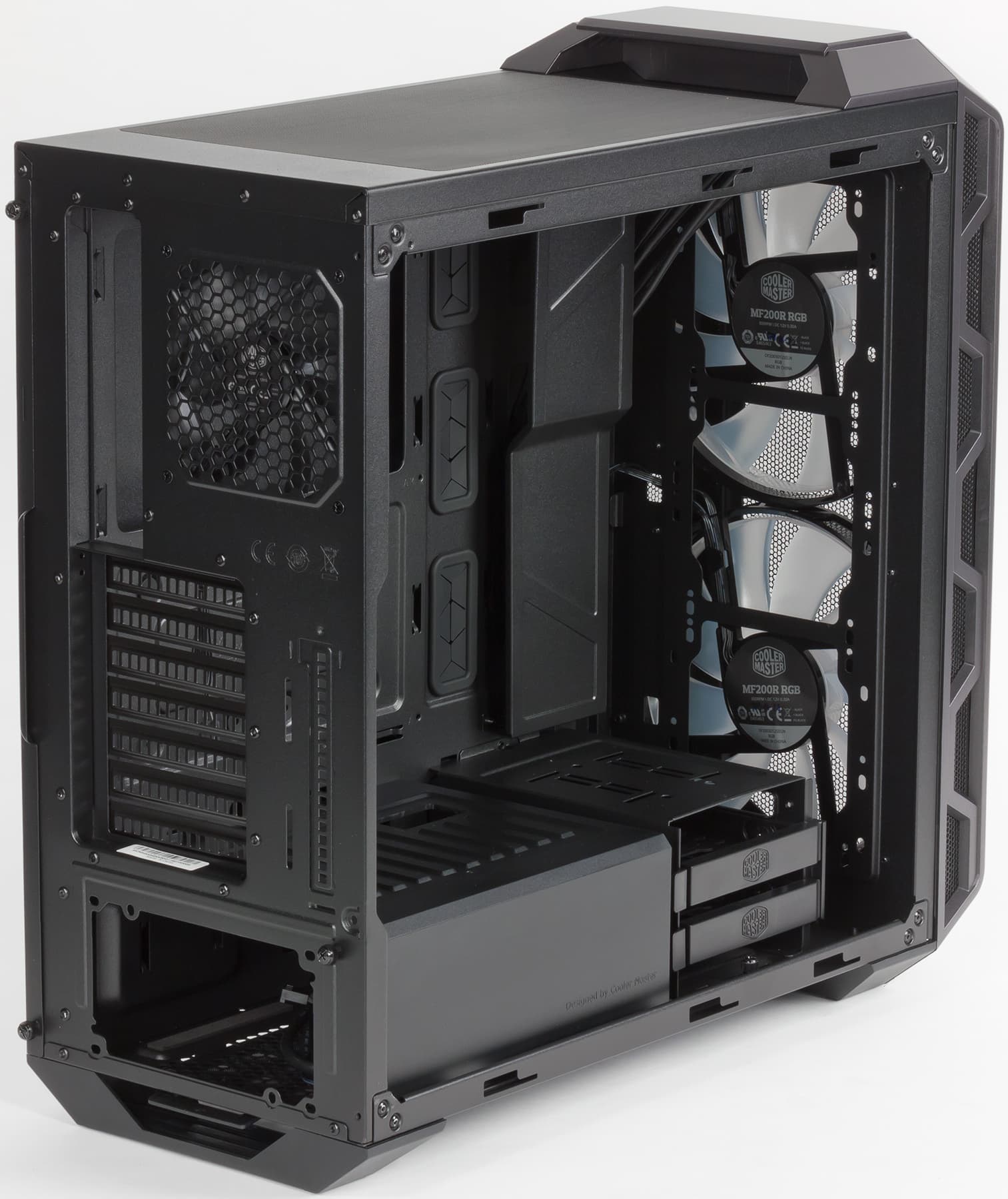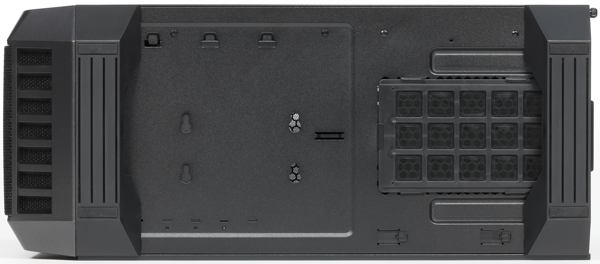 На днище шасси есть лишь отверстия в месте расположения блока питания, причем размер перфорированной области может быть маловат для самых больших 230-миллиметровых БП. Боковые стенки (и левая стеклянная, и правая металлическая) сплошные, размещение вентиляторов на них также невозможно.