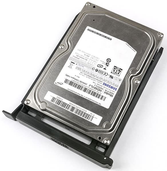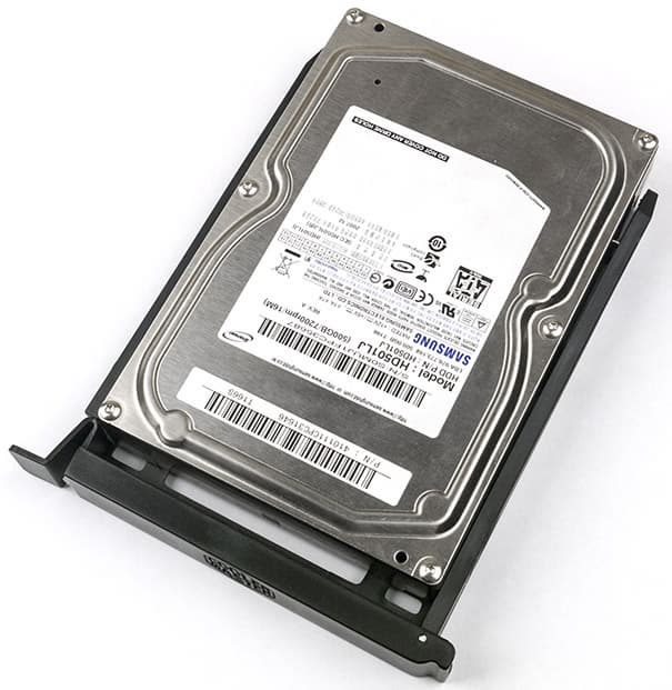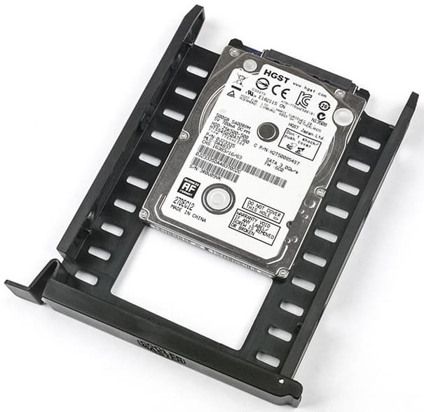 Крепление 3,5-дюймовых дисков в салазках осуществляется боковыми штифтами, оснащенными резиновыми амортизаторами для снижения вибраций. Возможно и дополнительная фиксация винтами, по одному с каждой стороны. 2,5-дюймовые SSD/HDD крепятся винтами снизу, для них амортизатором будет сам пластик днища салазок.
