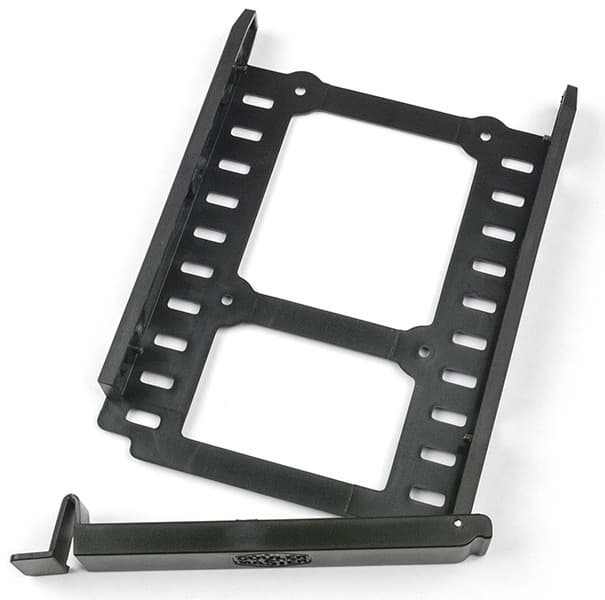 Используемые в дисковой стойке H500P универсальные двухформатные салазки уже встречались нам в других побывавших у нас корпусах Cooler Master. Они целиком пластиковые, передняя грань оформлена поворотной деталью, которая одновременно служит рукояткой для извлечения из стойки и креплением: с одной стороны у нее защелка, с другой фиксирующий выступ. Днище имеет отверстия, способствующие охлаждению нижней стороны накопителя, на которой расположена плата с электронными компонентами.