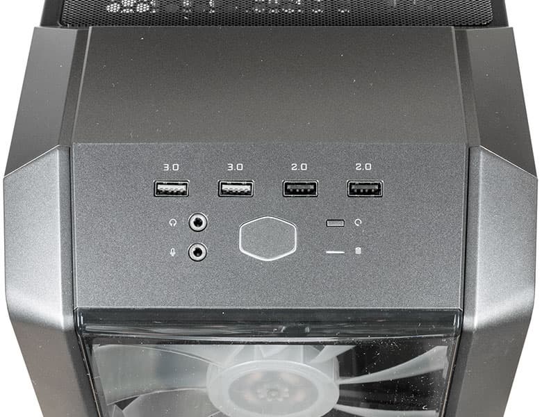 Содержимое панели управления расположено в два ряда, в верхнем находятся порты — по два USB 2.0 и USB 3.0 (без цветовой маркировки, но с цифровыми обозначениями сверху). Разъемы ориентированы в одну линию, а зазор между ними составляет 11 мм, поэтому возможны проблемы при одновременном подключении широких устройств в соседние порты.