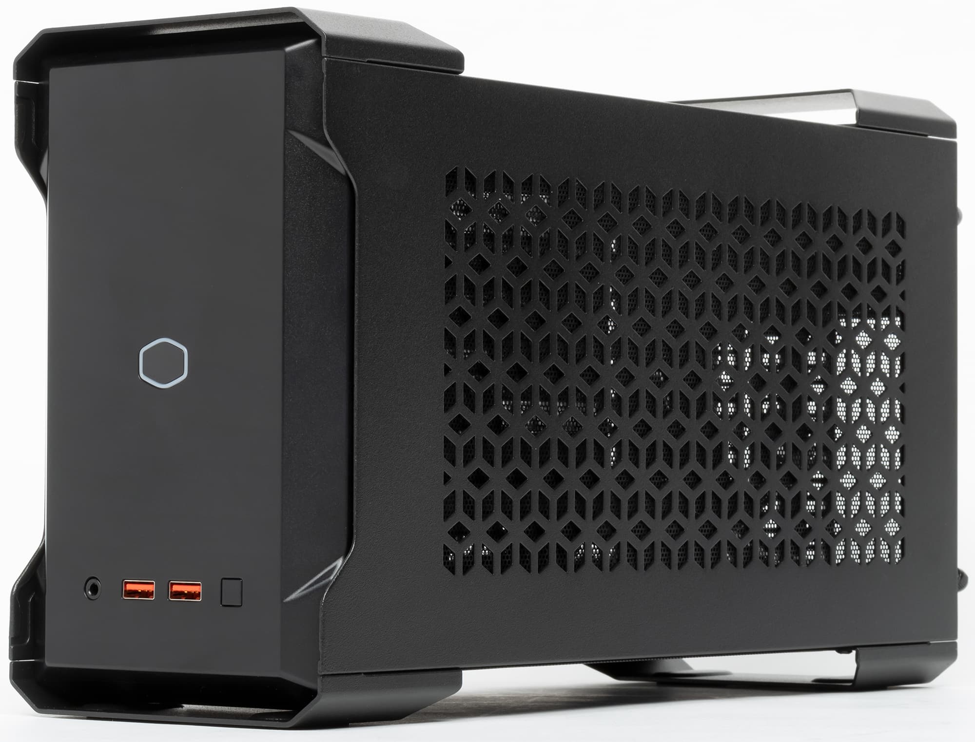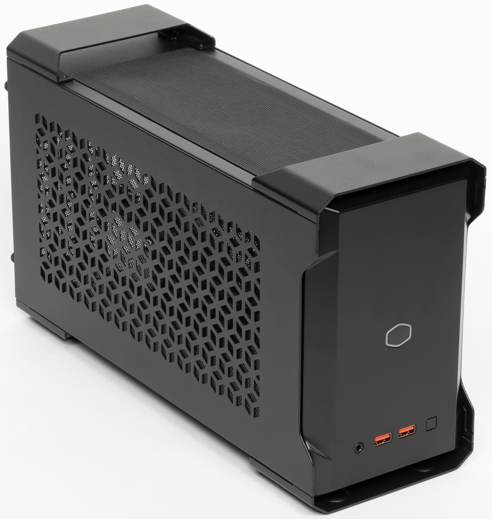 Однако у всего есть как плюсы, так и минусы. В частности, стандартный корпус имел объем в 5 литров, а NC100 уже тянет на 7,9 л, что приближается к некоторым системам на базе Mini-ITX. Но назвать громоздким корпус размерами 370×128×214 мм язык все равно не поворачивается — просто он немного больше самых миниатюрных вариантов. Внешность MasterCase NC100 перекликается с «полноразмерными» корпусами компании — чего стоят только стилизованные «ручки» для переноски. Но размеры не позволят спутать систему в таком корпусе с «полноразмерным» компьютером.