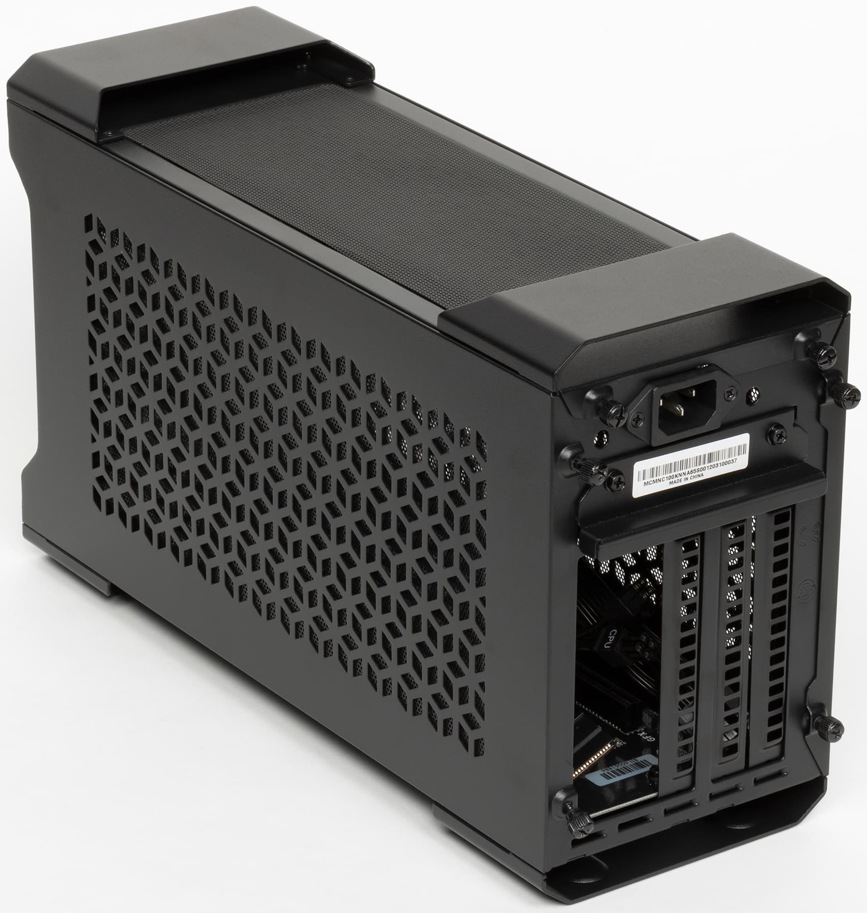 Для проверки мы установили в систему NUC 9 Extreme Compute Element NUC9i9QNB (топовое решение в нынешней линейке — на базе Intel Core i9-9980HK) и MSI GeForce GTX 1070 Gaming X 8G. Видеокарта уже далеко не новая, но нас интересовали энергопотребление и шум, а не рекорды производительности. Попутно выяснилось, почему Cooler Master рекомендует ограничиваться высотой карты в 112 мм: эта модель MSI имеет немного увеличенную высоту в сравнении с референсной PCB, и подключать кабели к двум разъемам питания в верхней части было не очень удобно. Мешали как раз лишние 8 мм, а будь там +15-18 мм, задача превратилась бы и вовсе в нетривиальную. Но тут все получилось: 280×120×37 мм встали в корпус как влитые. Заодно проявился плюс такой конструкции по сравнению с типовыми «башенками»: карта стоит вертикально, так что не выворачивает слот.