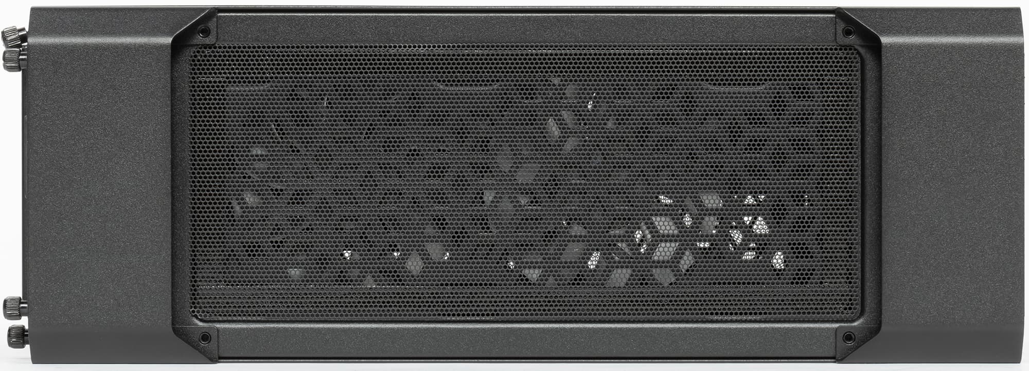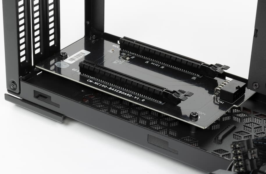 Интересно выглядит базовая плата: на ней только два разъема PCIe x16, то есть увеличенная толщина пошла на увеличение промежутка между Compute Element и видеокартой. Учитывая, что у многих видеокарт заметно нагревается и задняя стенка, это не лишняя предосторожность. Также это позволяет «впихнуть» посередине воздуховод, посредством которого вентилятор Compute Element будет забирать воздух не из внутреннего пространства, а снизу.